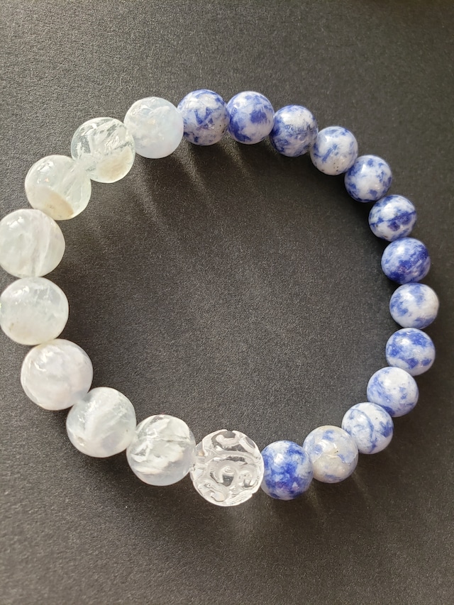 素材 フェザーフローライト 約9㎜×8 ソーダライト 約8㎜×13 マニ車模様・回紋珠(水晶) 約10㎜×1 オベロンゴム 大きさ 約16cm ~~~ ソーダライトとエンジェルフェザーフローライトのブレスレット紹介♪ 水晶マニ車模様(回紋珠)がポイントの、 エンジェルフェザーフローライトとソーダライトの美しいコントラストが魅力のデザインブレスレットです。 今回は白が多めのソーダライトです。 ・ラピスラズリの代用品として・ラピスラズリの構成成分の一つでもあるソーダライト。 ずっと石たちを見つめていたら、フェザーフローライトに合う♪ブルー系で!と組み合わせてみました。 水晶マニ車模様(回紋珠)がポイントで、手元に華やかさを添えてくれます。 可愛いいクールな感じになりました♪ ●マニ車とは、主にチベットの仏具で転経器(てんきょうき)とも呼ばれていて、 回転させた数だけ経を唱えるのと同じ功徳があるとされています。 心がザワザワしちゃった時や、頭の中の声が大きい時など マニ車をクルクルと回して落ち着いてみるのもオススメです。 マニ車模様の意味はちょっと横に置いといて… もちろん! デザインブレスとして、ぜひ可愛がってあげて下さい。 石たちが喜びますので(*^-^*) ご縁結びをよろしくお願いします☆ ~~~ ●写真の品物(ブレスレットのみ)をお届け致します。 ※撮影時の光の当たり具合やカメラの設定などにより写真と実物の色味が異なる場合がございます。 ●天然石のため(細かな傷を含め)傷や、欠け・ヘコミ・クラック(内部の割れ)・インクルージョン(内部の気泡や不純物)・ブレスレットの玉のサイズに若干の不揃い(±0.5前後)がある場合があります。 天然石の「魅力でもあり石の個性」としてご理解いただけると幸いです。 ●一つ一つ丁寧に作製しておりますが、ハンドメイドのため多少の誤差が生じますのでご了承下さい。 ●配送中の事故や破損・紛失等については当方で責任は負いかねます。 ●お客様都合の返品・返金・交換はいかなる場合でも応じる事が出来ませんので、よくご検討の上ご購入ください。 よろしくお願いします☆