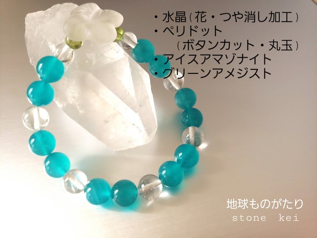 ☆★☆ 素材 ☆★☆ 水晶(花・つや消し加工) 1個 ペリドット(ボタンカット) 約3-4㎜×2 ペリドット 約5.5㎜×2 アイスアマゾナイト 約8.5㎜×12 グリーンアメジスト 約8㎜×5 水晶 約6㎜×2 オベロンゴム 大きさ 約15cm・少しゆるめ ~~~ お花のブレスレットです。 一目惚れした水晶の(つや消し)お花をメインにブレスレットを作りました。 お花のすぐ横は目立たないのですが、 ボタンカットのペリドット・丸玉ペリドットを配置しました。 ブレスレット全体の形として○ではなく シズク型です。 (手首につけた時に形の違和感もないと思います) 清涼感のあるアイスアマゾナイトの色合いは、どんなシーンでも爽やかな気分にさせてくれます。そして、艶消しクリスタルは、華やかな表情を与え、あなたの魅力を一層引き立ててくれます。 ぜひご縁結びをよろしくお願いします。 ~~~ ・ペリドット 和名・橄欖石(かんらんせき) 古代人が「太陽が爆発して飛んできた石」と信じられてきた石だそうです。 ・グリーンアメジスト アメジストが加熱により美しいグリーン色に変化したものです。 ヒーリング 癒しと安らぎ/人間関係のトラブルを解決に導 く/知性の働きを高める など… ・アマゾナイト 石言葉 心の強化/夢と希望/ 表現力UP など… ※意味合いなどほんの一部です。 調べるとまだまだ出てきます。 ※天然石の意味合いは言い伝え等によるもので効果を保証するものではありません。 ●写真の品物(ブレスレットのみ)をお届け致します。 ※撮影時の光の当たり具合やカメラの設定などにより写真と実物の色味が異なる場合がございます。 ●天然石のため(細かな傷を含め)傷や、欠け・ヘコミ・クラック(内部の割れ)・インクルージョン(内部の気泡や不純物)・ブレスレットの玉のサイズに若干の不揃い(±0.5前後)がある場合があります。 天然石の「魅力でもあり石の個性」としてご理解いただけると幸いです。 ●一つ一つ丁寧に作製しておりますが、ハンドメイドのため多少の誤差が生じますのでご了承下さい。 ●配送中の事故や破損・紛失等については当方で責任は負いかねます。 ●お客様都合の返品・返金・交換はいかなる場合でも応じる事が出来ませんので、よくご検討の上ご購入ください。 ☆よろしくお願いします☆