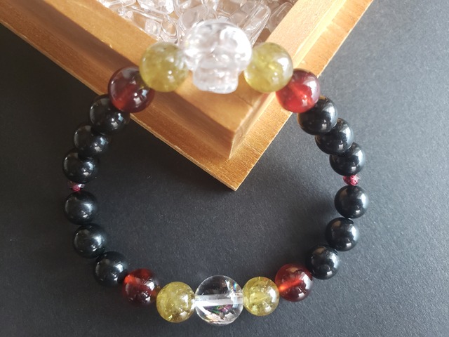 素材 水晶スカル 約12㎜×1 グリーンガーネット 約8㎜×4 ヘソナイトガーネット 約8㎜×4 ヘソナイトガーネット 約4㎜×2 シュンガイト 約7.5㎜×12 ヒマラヤ水晶アイリスクォーツ 約10㎜×1 オベロンゴム 大きさ 約16cm ~~~ 縁あって水晶スカルを入荷できました! 今回はバチバチバチとピースがハマるように、 まるでクリスタルスカルと石たちが話を合わせていたかのように そして石が「私も!」と立候補してくれて出来たのが、この水晶スカルブレスレット!! スカルやドクロと聞くと、「えっ!? ブレスレットに???」 と思うと思います。 私もそうでした(* >ω<) でもね、 ドクロはお守りや魔除けになるんです。 そして、 このクリスタルスカルは、なんか優しい。 ブレスレットにしたい。 そう思い作りました(*^^*) ドクロはお守りや魔除けのグッズとして有名!! また仏教では、ドクロは「人生無常」のシンボルであり、悪運から幸運への転換を意味することがあるそうですよ♪ ※写真3枚目がスカルの裏側になります。 ※この価格は「ベイス・今のみ!~夏だね。激暑価格~ 」です。 是非お早めにお求め下さい☆ (・時間の経過で予告なく通常価格になる場合もあります。) 是非ご検討・ご購入をよろしくお願いします ~~~ ●写真の品物(ブレスレットのみ)をお届け致します。 ※撮影時の光の当たり具合やカメラの設定などにより写真と実物の色味が異なる場合がございます。 ●天然石のため(細かな)傷や、欠け・ヘコミ・クラック(内部の割れ)・インクルージョン(内部の気泡や不純物)・ブレスレットの玉のサイズに若干の不揃い(±0.5前後)がある場合があります。天然石の魅力でもあり石の個性としてご理解いただけると幸いです。 ●一つ一つ丁寧に作製しておりますが、ハンドメイドのため多少の誤差が生じますのでご了承下さい。 ●配送中の事故や破損・紛失等については当方で責任は負いかねます。 ●お客様都合の返品・返金・交換はいかなる場合でも応じる事が出来ませんので、よくご検討の上ご購入ください。(お気軽にお問い合わせください♪) よろしくお願いします☆