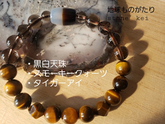 Instagramにて動画up中 ☆素材☆ 黒白天珠 1個 スモーキークォーツ 約6㎜×2 スモーキークォーツ 約8㎜×6 スモーキークォーツ(スターカット) 約8㎜×2 タイガーアイ 約8㎜×9 タイガーアイ(スターカット) 約8㎜×2 オベロンゴム(茶系) 大きさ 約16cm ★黒白天珠・・・陰陽の調和を意味しており 白は天・黒は地を象徴し、悪い運を良い運に変えて、天地のパワーが一心に集まり運勢上昇させ てくれるといわれています。 ★スモーキークォーツ・・・煙がかかったようなブラウンの色合いが特徴の石ですが、一般的に流通しているものはクォーツに照射処理をしているものです。 スモーキークォーツのヒーリング効果 精神の安定/ストレスを鎮め、心をリラックスした状態へと導く/ネガティブな工ネルギーを除去する/忍耐力を養う/貯蓄運をもたらす/気の浄化/家庭運を上げる/インスピレーションや発想力の開花など。 ★タイガーアイ・・・日本では「虎目石」とも呼ばれています。古代エジプトでは、洞察力・直観力・決断力を養い、物事の本質を見抜く力を与え、視野を広げてくれると信じられてきたそうです。 ※天然石の意味合いは言い伝え等によるもので効果を保証するものではありません。 ~~~ 天珠を使ったデザインブレスです。 私が作る半々ブレスはメインの石を中心に左右で色を分けがちなのですが 石をボーッと見ていたら、半々ブレスだって色々なバリエーションがあっても面白い!と思って出来上がった作品です。 自分の中で持っているポジティブなエネルギーは、運勢を上げることが出来ます。 黒白天珠のデザインブレスは、そんなポジティブな気持ちを呼び起こすアイテムです。 黒と白の2つの石がメインになっているので、どんなファッションとも合わせやすく、ビジネスやプライベートに使えます。 さらに、天珠の石のパワーで、ストレスを追い払ったり、背中を押してくれるとも言われています。自分へのご褒美や、大切な人への贈り物にも最適です。 このブレスレットは限定品なので、お早めに手に入れてください☆ ぜひご縁結びを よろしくお願いします☆ ~~~ ●写真の品物(ブレスレットのみ)をお届け致します。 ※撮影時の光の当たり具合やカメラの設定などにより写真と実物の色味が異なる場合がございます。 ●天然石のため(細かな傷を含め)傷や、欠け・ヘコミ・クラック(内部の割れ)・インクルージョン(内部の気泡や不純物)・ブレスレットの玉のサイズに若干の不揃い(±0.5前後)がある場合があります。 天然石の「魅力でもあり石の個性」としてご理解いただけると幸いです。 ●一つ一つ丁寧に作製しておりますが、ハンドメイドのため多少の誤差が生じますのでご了承下さい。 ●配送中の事故や破損・紛失等については当方で責任は負いかねます。 ●お客様都合の返品・返金・交換はいかなる場合でも応じる事が出来ませんので、よくご検討の上ご購入ください。 ☆よろしくお願いします☆