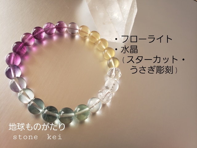 素材 水晶(うさぎ彫刻) 約8㎜×1 水晶(スターカット) 約8㎜×2 フローライト 約7.5㎜×20 オベロンゴム 大きさ 約15cm ~~~ 水晶にうさぎの彫刻と、フローライトをグラデーションに配置した透明感のある キラキラブレスです。 水晶のうさぎは素彫りなので、主張しすぎることないけど、 フッとした瞬間に眺めていると可愛い姿がみられます。 “フローライトは感情のバランスを整え、心と体を落ち着かせる石。ウサギは幸運のシンボルです。このうさぎとフローライトのグラデーションブレスレットは、幸せな気持ちになれるだけでなく、心身共にリラックスさせ、幸運を引き寄せるお守りにぴったりのアクセサリーです。 是非、ご縁結びをよろしくお願いします☆ ~~~ ☆フローライト☆ トルマリンに次いで豊富なカラーバリエーションを持つ石です。 「天才の石」とも呼ばれています。 心身を癒すヒーリングストーンとしても活躍中 和名:蛍石 ☆うさぎ☆ 縁起物: 商売繁盛/子孫繁栄/無病息災 など ただただ、可愛い☆ 癒しの効果だけではなく、縁起が良い動物 ※意味合いなどほんの一部です。 詳しく調べるとまだまだ出てきます。 ※天然石の意味合いは言い伝え等によるもので効果を保証するものではありません。 ●写真の品物(ブレスレットのみ)をお届け致します。 ※撮影時の光の当たり具合やカメラの設定などにより写真と実物の色味が異なる場合がございます。 ●天然石のため(細かな)傷や、欠け・ヘコミ・クラック(内部の割れ)・インクルージョン(内部の気泡や不純物)・ブレスレットの玉のサイズに若干の不揃いがある場合があります。天然石の魅力でもあり石の個性としてご理解いただけると幸いです。 ●一つ一つ丁寧に作製しておりますが、ハンドメイドのため多少の誤差が生じますのでご了承下さい。 ●配送中の事故や破損・紛失等については当方で責任は負いかねます。 ●お客様都合の返品・返金・交換はいかなる場合でも応じる事が出来ませんので、よくご検討の上ご購入ください。 よろしくお願いします☆