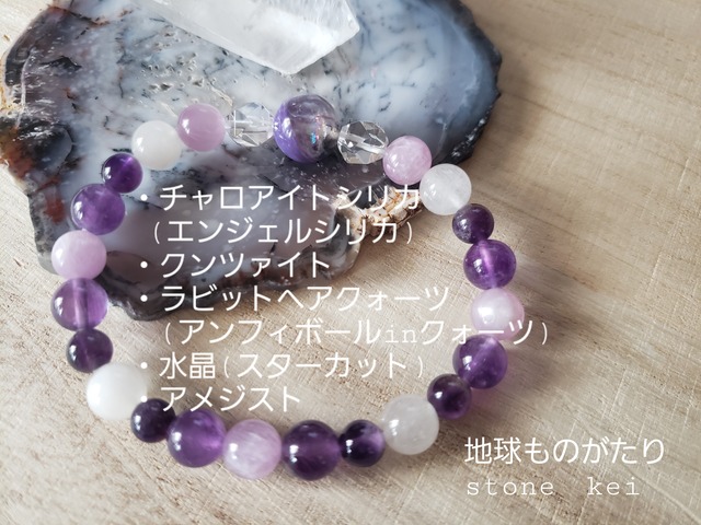 素材 エンジェルシリカ/(チャロアイトシリカ) 約11㎜×1 (ラベンダーカラーの) クンツァイト 約8㎜×5 ラビットヘアクォーツ/(アンフィボールinクォーツ) 約8㎜×4 水晶(スターカット) 約8㎜×2 アメジスト 約6㎜×6 約8㎜×6 オベロンゴム 大きさ 約16cm ~~~ エンジェルシリカの登場です!! チャロアイトが素敵すぎて、いつか作品にしたい! そう思いつつも、心トキメくチャロアイトとの出会いがなかなか訪れなかったのです… (もちろん、以前出していたブラックチャロアイトもかなり素敵でしたo(*゚∀゚*)o♪ ) なんと!今回はチャロアイトと水晶からなる 流通名「エンジェルシリカ」と縁あって入手できました(*^-^)(*’ω’ノノ゙☆パチパチ もう美しい! ただそれだけ。 チャロアイト部分のマーブル感も。 このエンジェルシリカ、 実は… ちょっとヘコみ(平になっている場所)と、天然石らしく内包物(黒っぽく見える部分)もあるのですが この美女(石)の「水晶部分の虹の美しさ」を是非楽しんでいただきたいステキな石です。 シンプルながらも美しいデザインなので、普段のコーディネートにも合わせやすく、おしゃれなアクセントにもなります。 ご縁結びをよろしくお願いします☆ ~~~ ☆エンジェルシリカ(チャロアイトシリカ) ・エンジェルシリカはチャロアイト同様、非常に強力なヒーリング効果があり ・元々のチャロアイトに浄化作用の強いクォーツの成分が入っているため、最高の癒やし効果を得られる石と言われるほどです。 ☆ラビットヘアクォーツ(アンフィボールinクォーツ) ・「その直感こそが、あなたにとってのただ一つの正解である。」と教えてくれる石 ・直観力を高めるだけではなく、その直観を信じられるようサポートしてくれる効果もある。 ☆クンツァイト ・深い愛情と癒やしの波動 ・感情の安定 ・自分らしさを引き出してくれる など。 ☆アメジスト ・霊性の高い石 ・マイナスのエネルギーをプラスに変える効果があるといわれている。 ※まだその他、意味合いなどあります。 ※天然石の意味合いは言い伝え等によるもので効果を保証するものではありません。 ●写真の品物(ブレスレットのみ)をお届け致します。 ※撮影時の光の当たり具合やカメラの設定などにより写真と実物の色味が異なる場合がございます。 ●天然石のため(細かな傷を含め)傷や、欠け・ヘコミ・クラック(内部の割れ)・インクルージョン(内部の気泡や不純物)・ブレスレットの玉のサイズに若干の不揃い(±0.5前後)がある場合があります。 天然石の「魅力でもあり石の個性」としてご理解いただけると幸いです。 ●一つ一つ丁寧に作製しておりますが、ハンドメイドのため多少の誤差が生じますのでご了承下さい。 ●配送中の事故や破損・紛失等については当方で責任は負いかねます。 ●お客様都合の返品・返金・交換はいかなる場合でも応じる事が出来ませんので、よくご検討の上ご購入ください。 よろしくお願いします☆