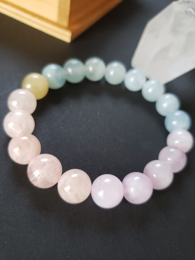 ☆☆☆ 素材 ☆☆☆ Mixベリル 約9㎜×19 オベロンゴム 薄ピンク ※ご希望があれば白オベロンに変更可能です。 変更ご希望の方はご購入前にメッセージお願いします☆ 大きさ 約15cm ~~~ Mixベリル・グラデーションブレスレット Mixベリルは柔らかなパステルカラーで観てるだけで心が穏やかになる気がします。 ランダム配置も可愛いけど グラデーションにしたくてグラデーションにしました。ミルキーな感じも、さらに可愛い!!(*^^*)そんな逸品です。 石のサイズも約9㎜前後で、このブレスレットだけでも存在感のあるサイズだな。と思います。 華やかでありながら、程よいシックさも併せ持っており、オフィスシーンやフォーマルな場所でも大活躍間違いなし!お好きなアクセサリーと組み合わせて楽しむのもオススメです。 ご縁結びをよろしくお願いします☆ ~~~ ※ベリルは鉱物グループの名称(総称)です。 色によって呼び名(流通名)が異なり、緑色のベリルをエメラルド、水色はアクアマリン、ピンクはモルガナイト、黄緑色はヘリオドール、黄色はイエローベリル、褐色系の黄色はゴールデン・ベリル、透明はゴシェナイトといいます。 ●写真の品物(ブレスレットのみ)をお届け致します。 ※撮影時の光の当たり具合やカメラの設定などにより写真と実物の色味が異なる場合がございます。 ●天然石のため(細かな傷を含め)傷や、欠け・ヘコミ・クラック(内部の割れ)・インクルージョン(内部の気泡や不純物)・ブレスレットの玉のサイズに若干の不揃い(±0.5前後)がある場合があります。 天然石の「魅力でもあり石の個性」としてご理解いただけると幸いです。 ●一つ一つ丁寧に作製しておりますが、ハンドメイドのため多少の誤差が生じますのでご了承下さい。 ●配送中の事故や破損・紛失等については当方で責任は負いかねます。 ●お客様都合の返品・返金・交換はいかなる場合でも応じる事が出来ませんので、よくご検討の上ご購入ください。 よろしくお願いします☆
