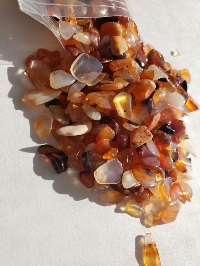 瑪瑙のさざれ石100gです。 オルゴナイトや小瓶に入れてインテリアとしても可愛いですよ。 使い方はご自由にお使い下さい(*^^*) 細かな傷や、欠け・大きさや形・内包物の有無など、数は異なりますが100gにそろえてあります。 ●配送中の事故や破損・紛失等については当方で責任は負いかねます。 ●お客様都合の返品・返金・交換はいかなる場合でも応じる事が出来ませんので、よくご検討の上ご購入ください。