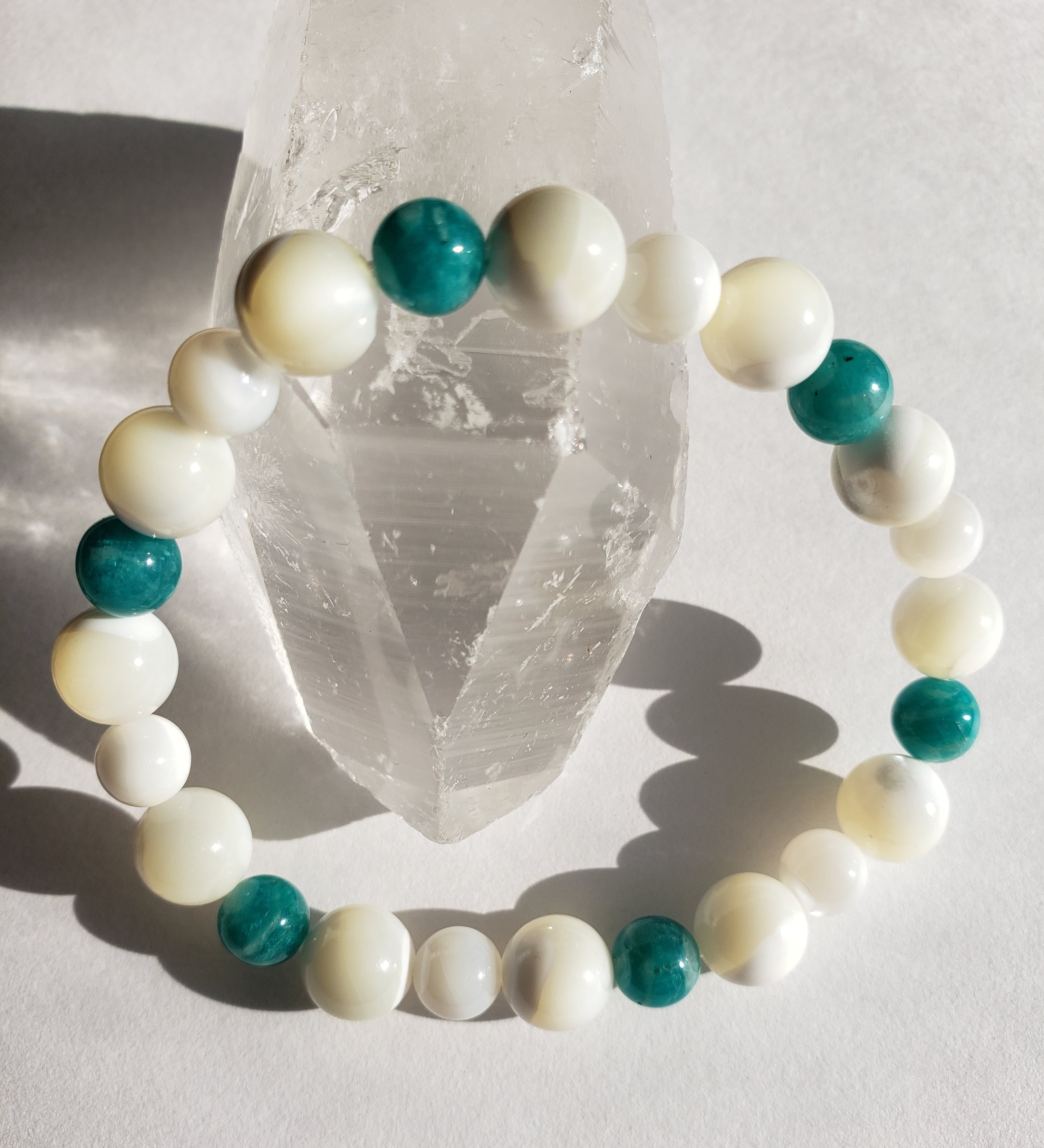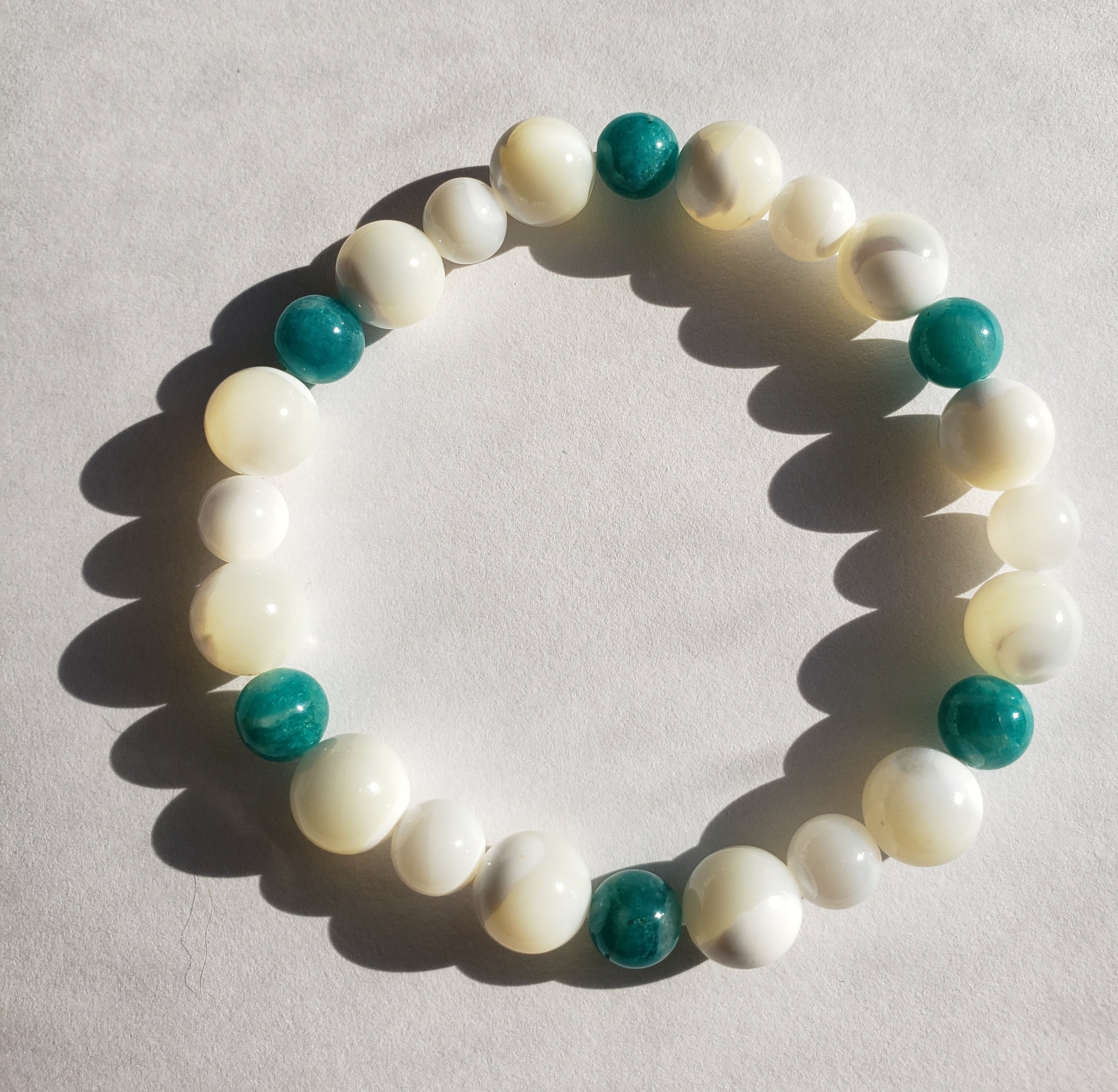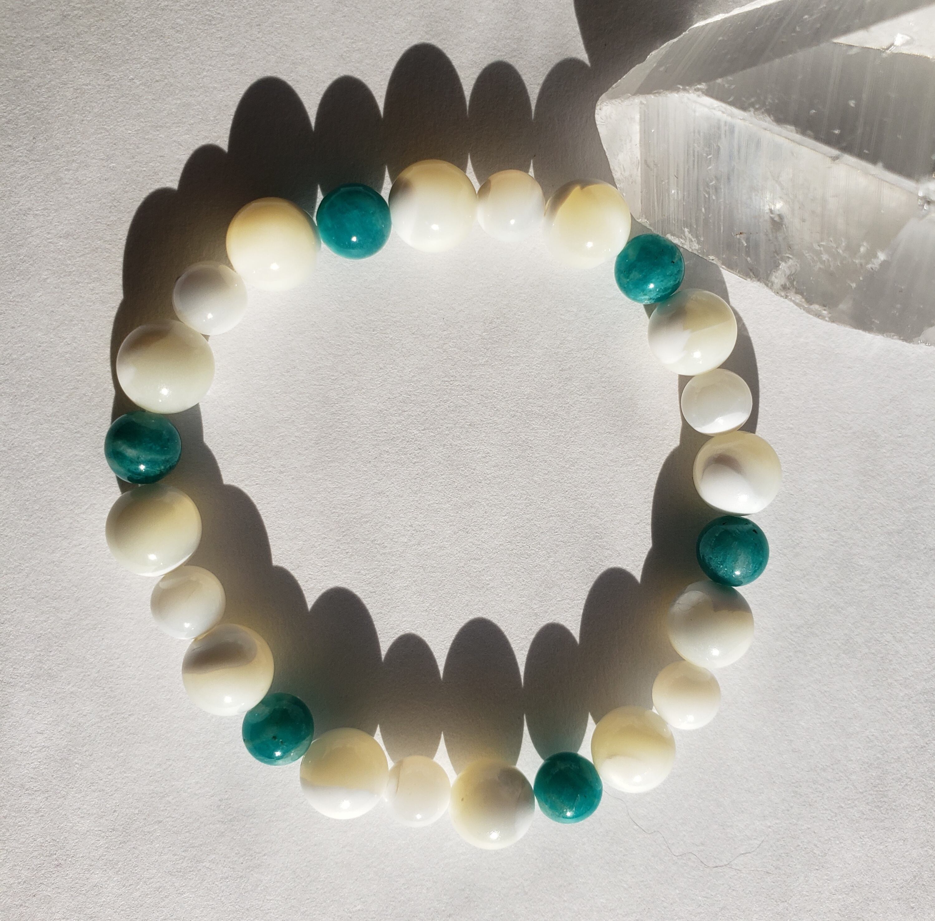 マザーオブパールとの色合いも可愛いく、アマゾナイトで六芒星をイメージした配置にしてあります☆