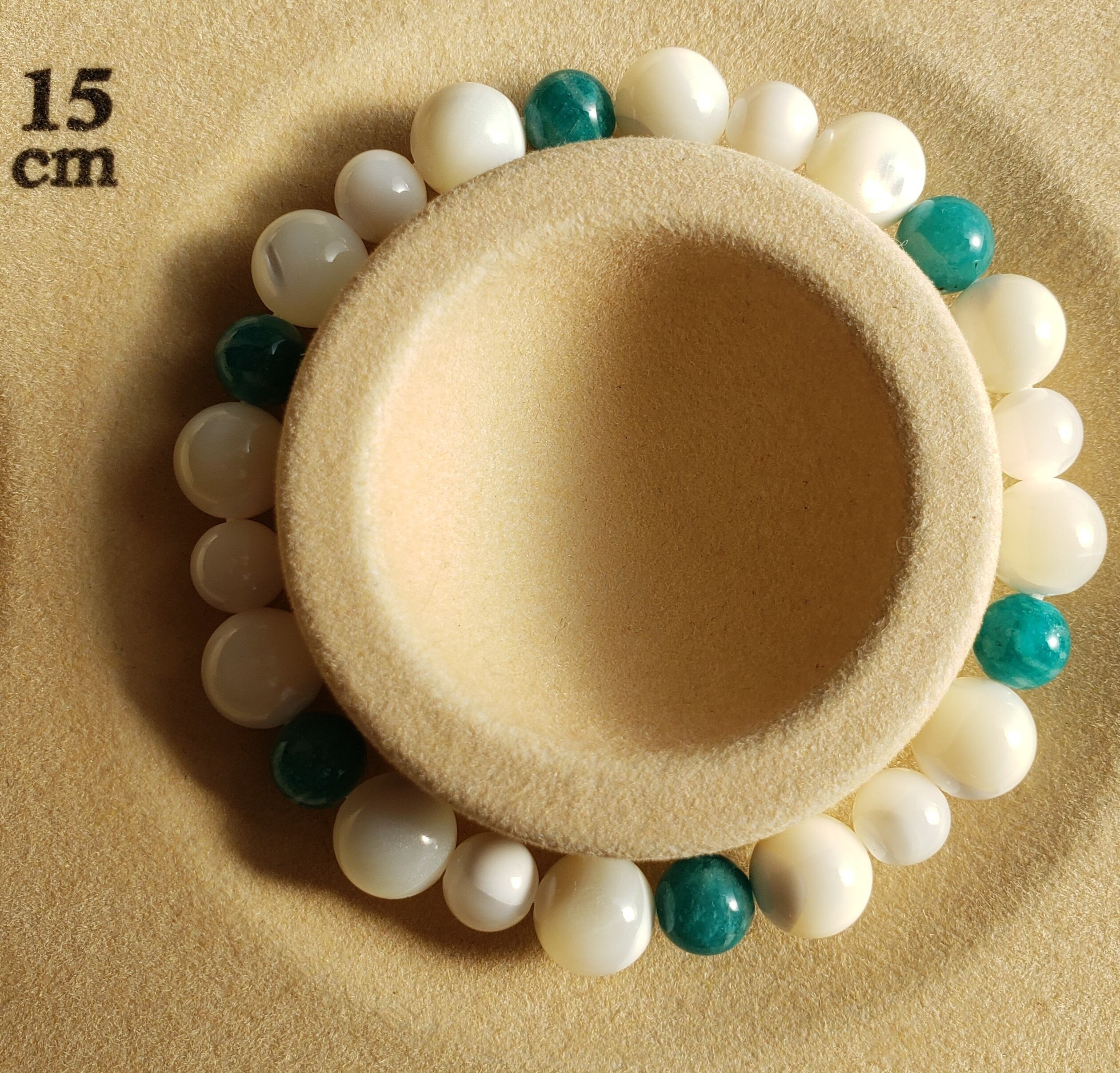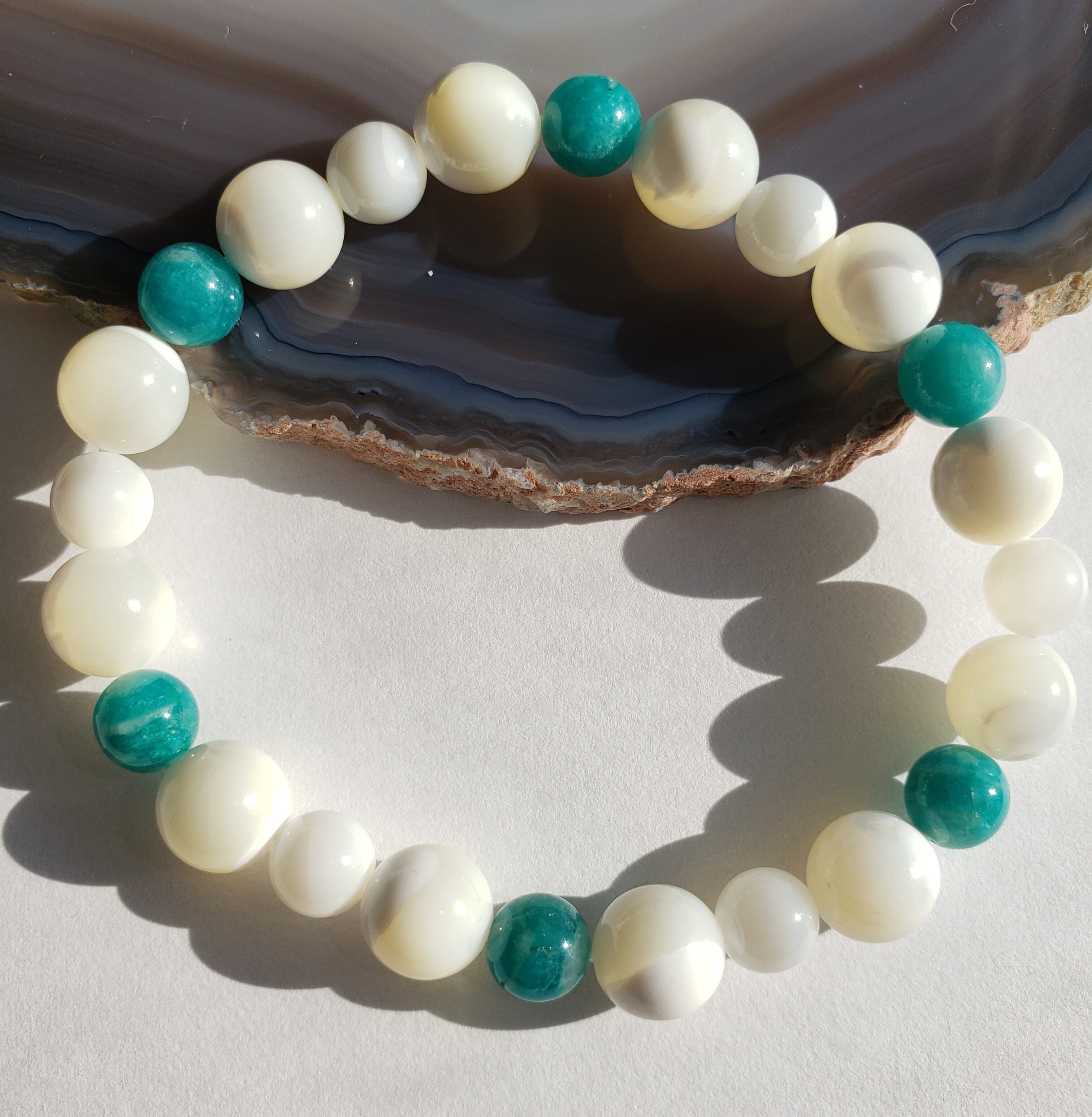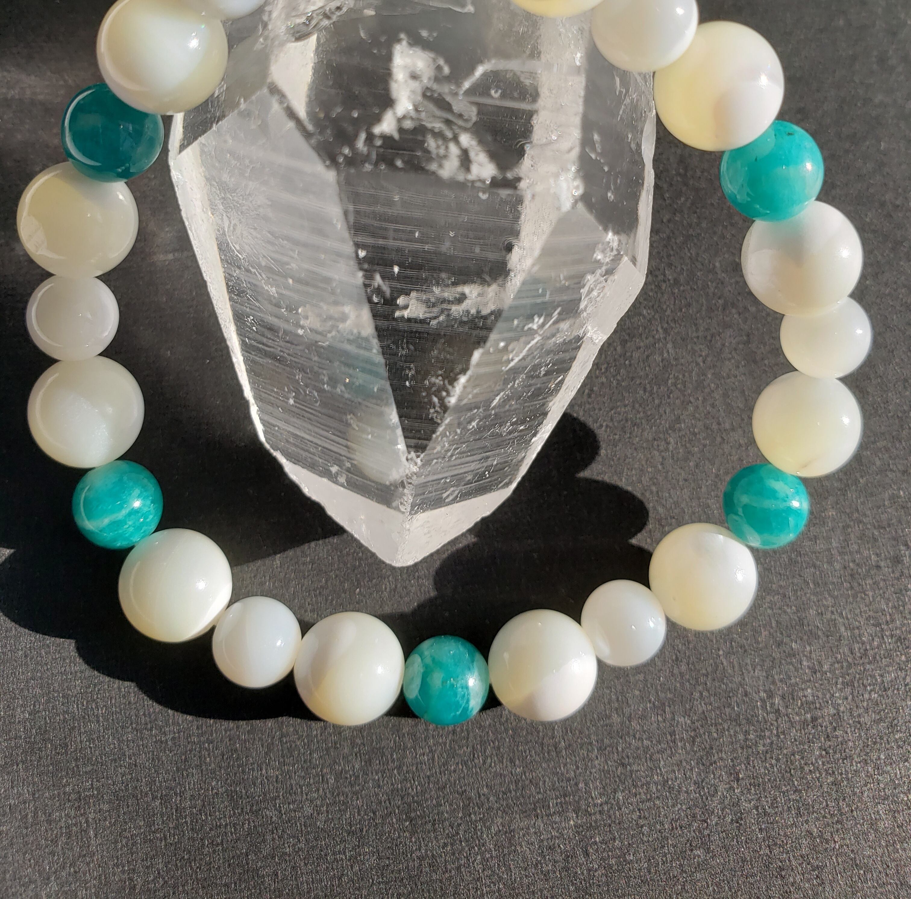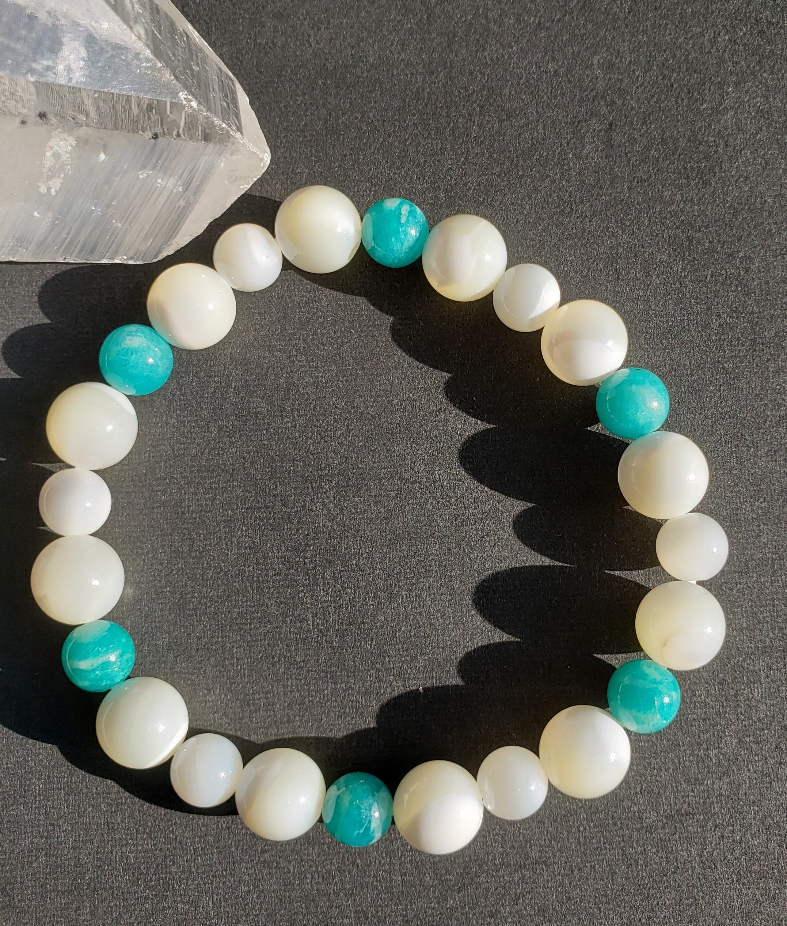 マザーオブパールとの色合いも可愛いく、アマゾナイトで六芒星をイメージした配置にしてあります☆