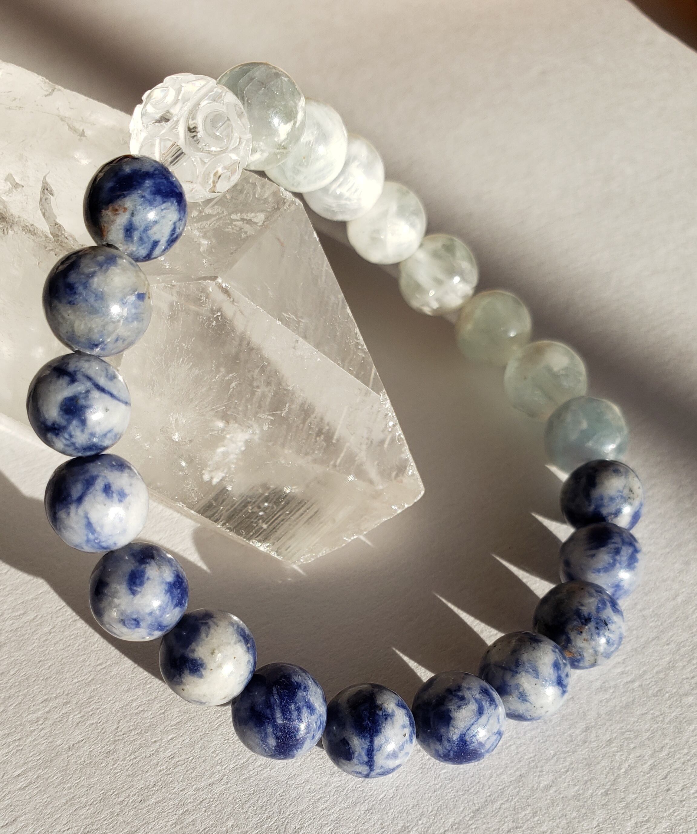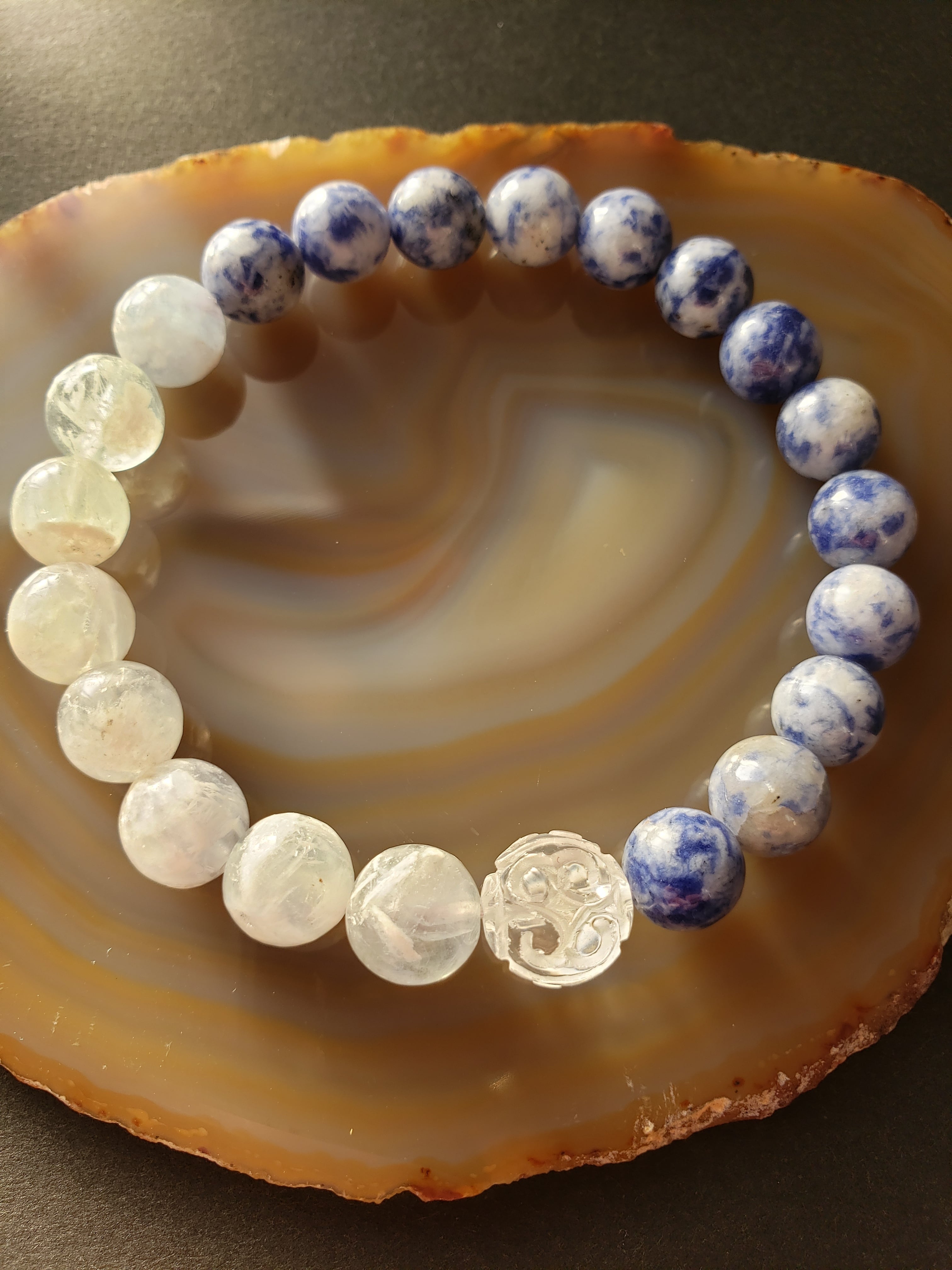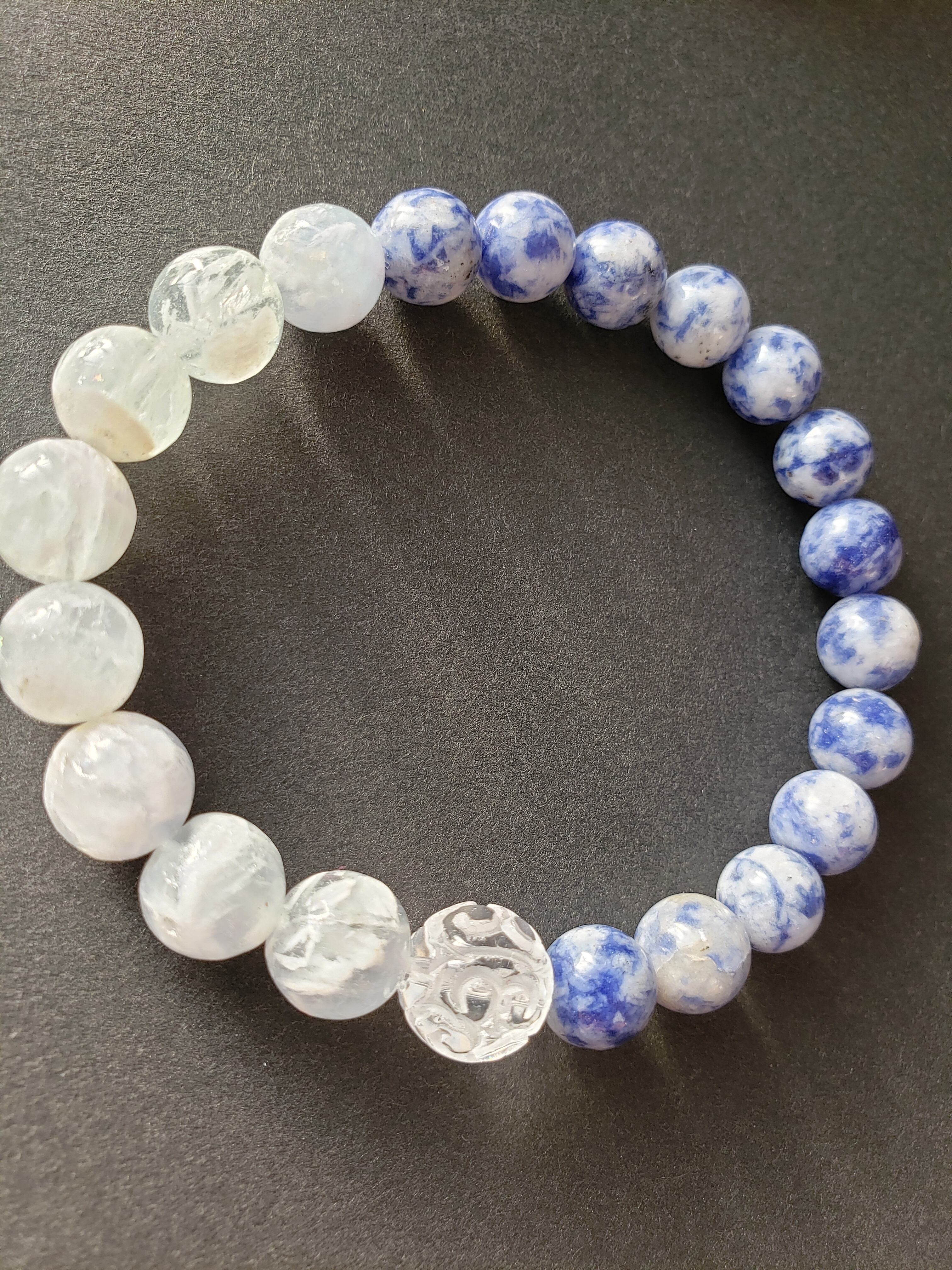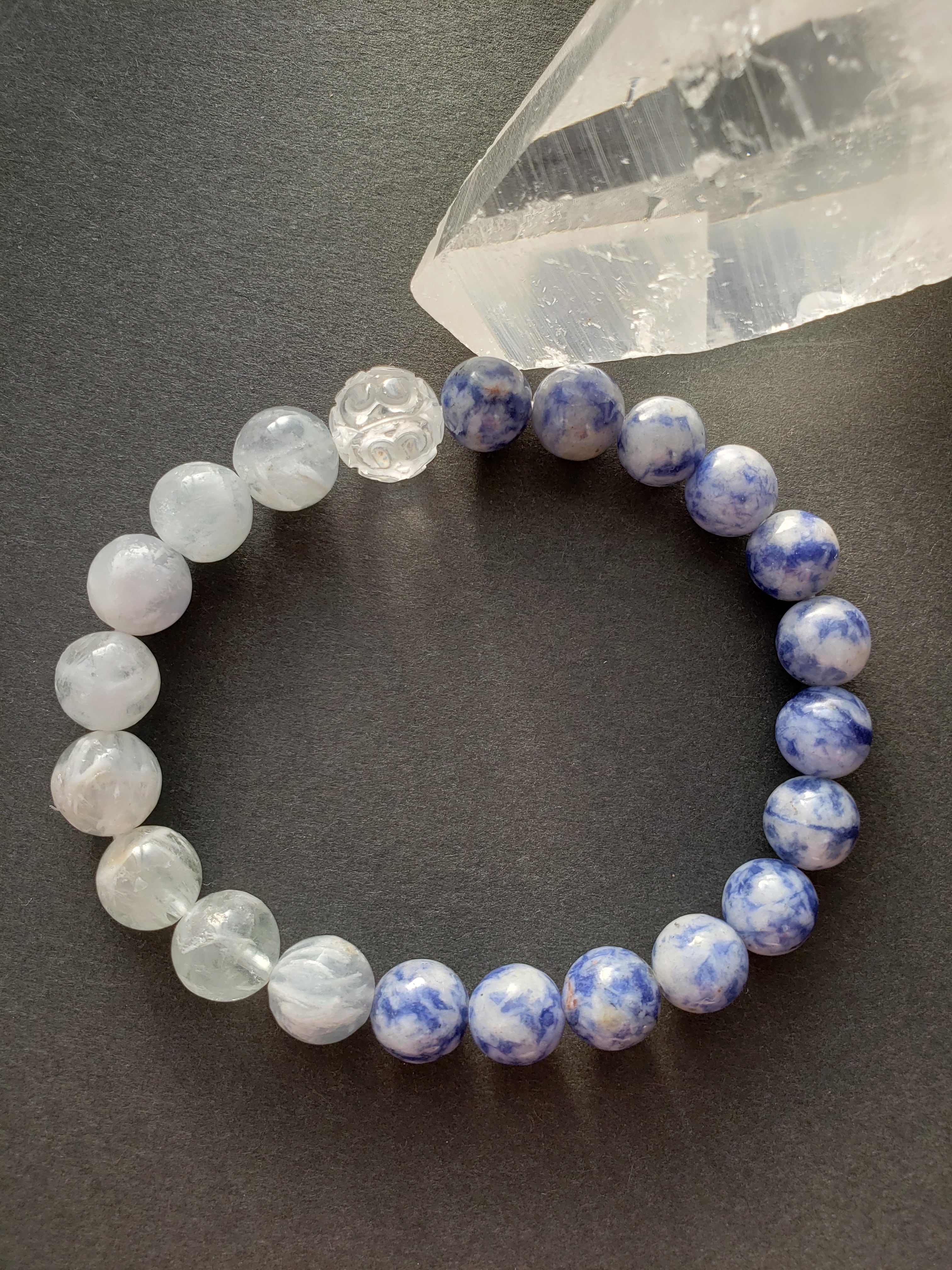 エンジェルフェザーフローライトとソーダライトの美しいコントラストが魅力のデザインブレスレットです。