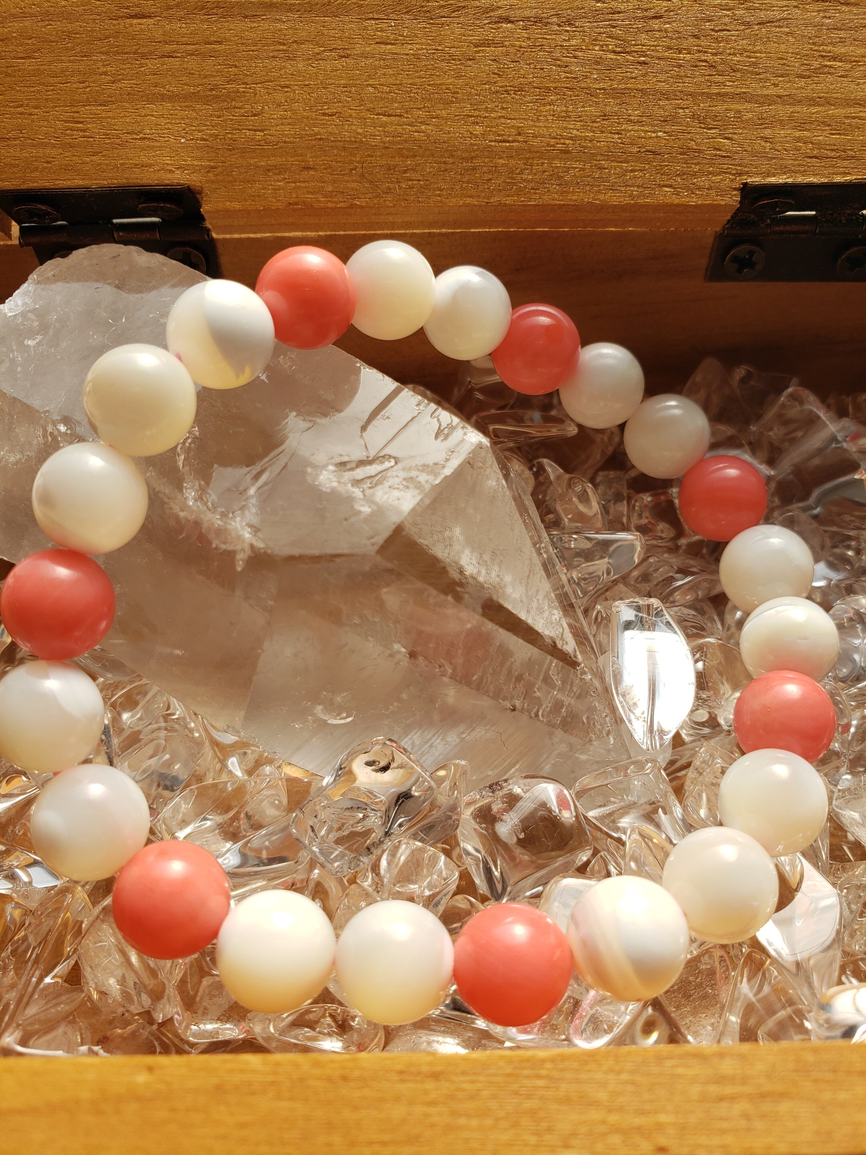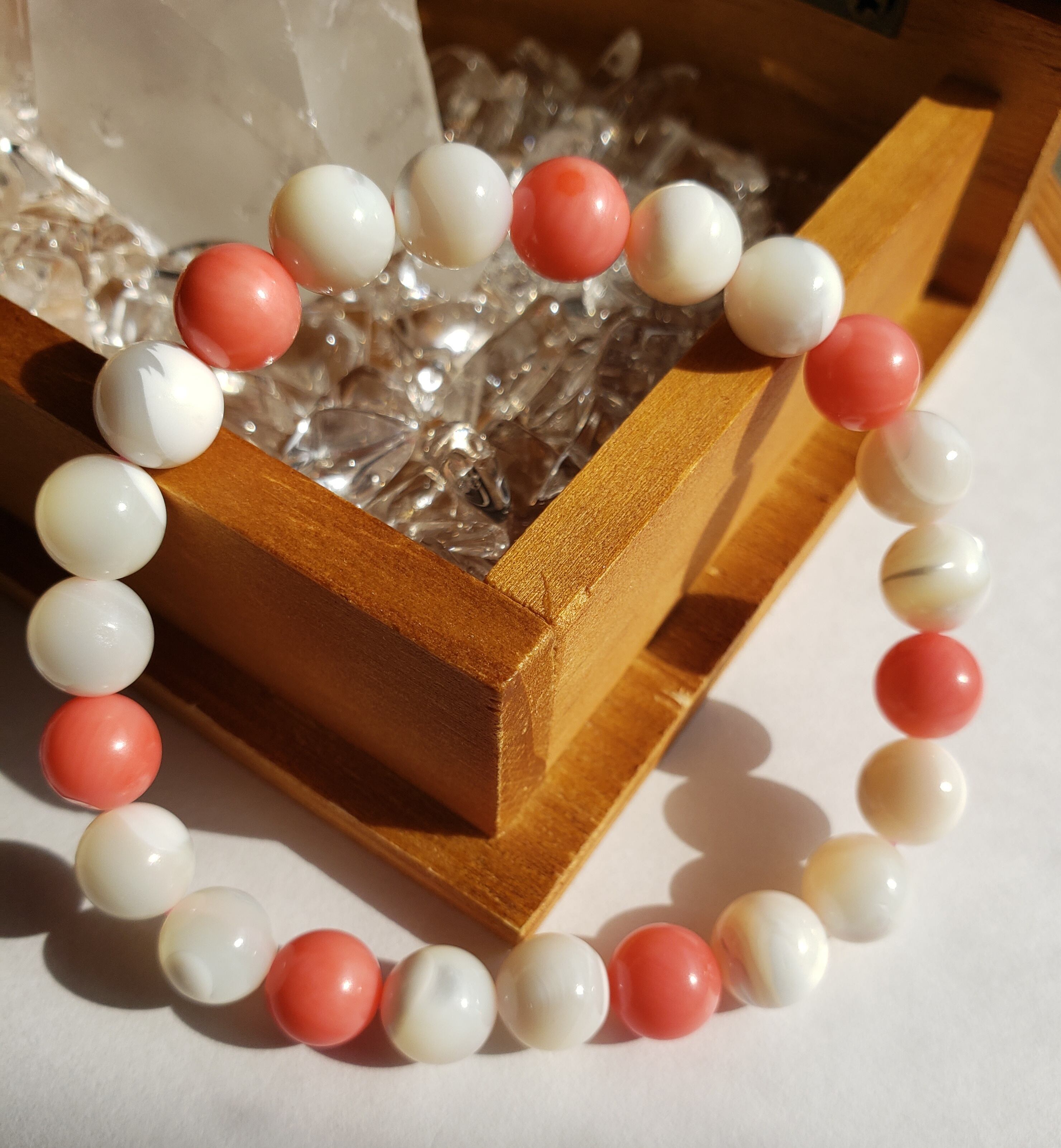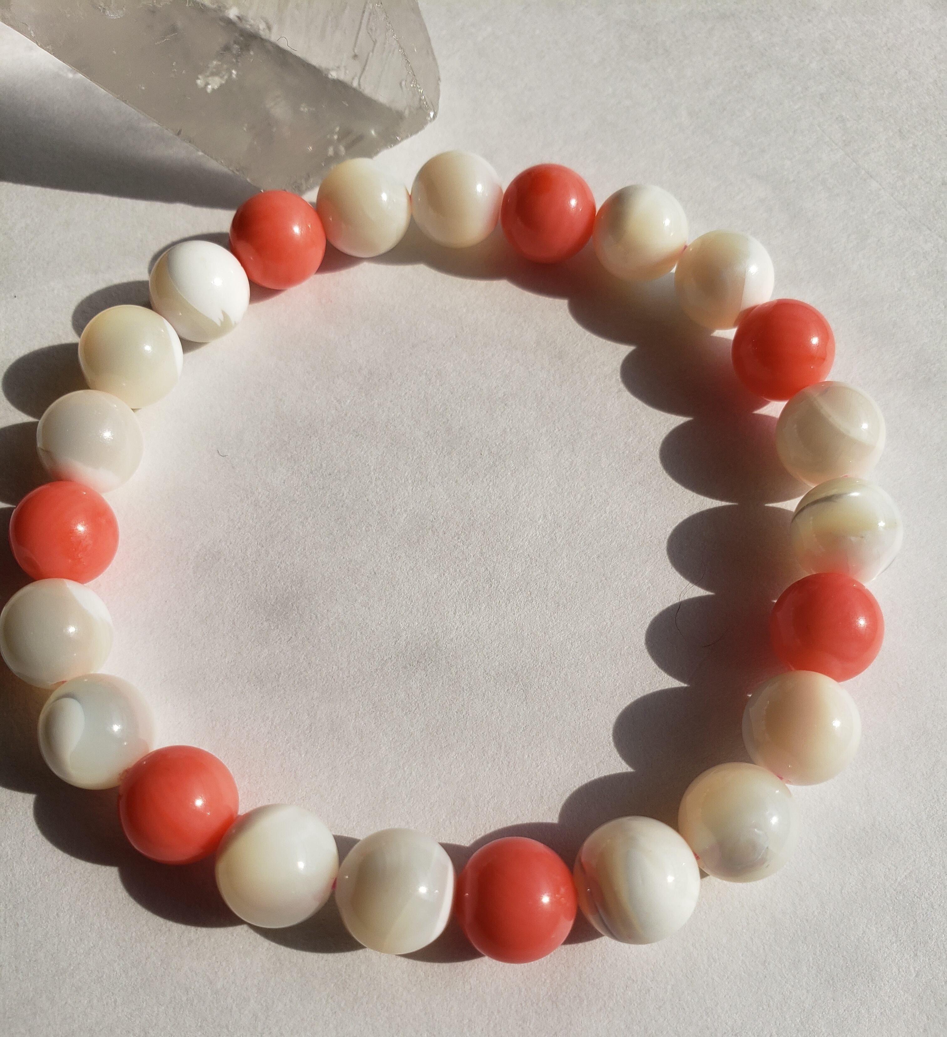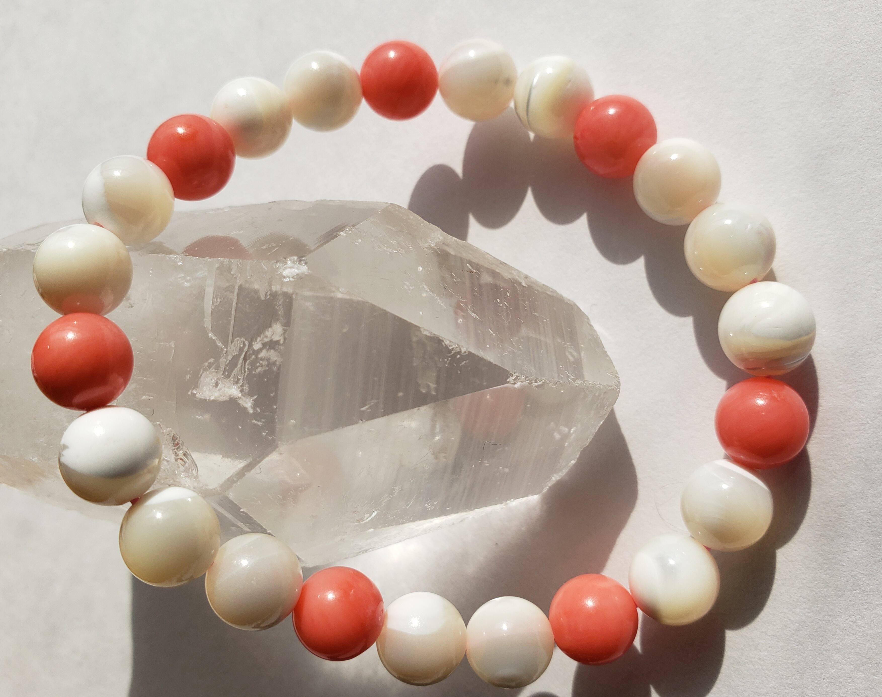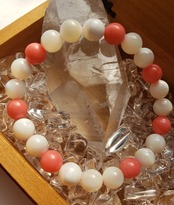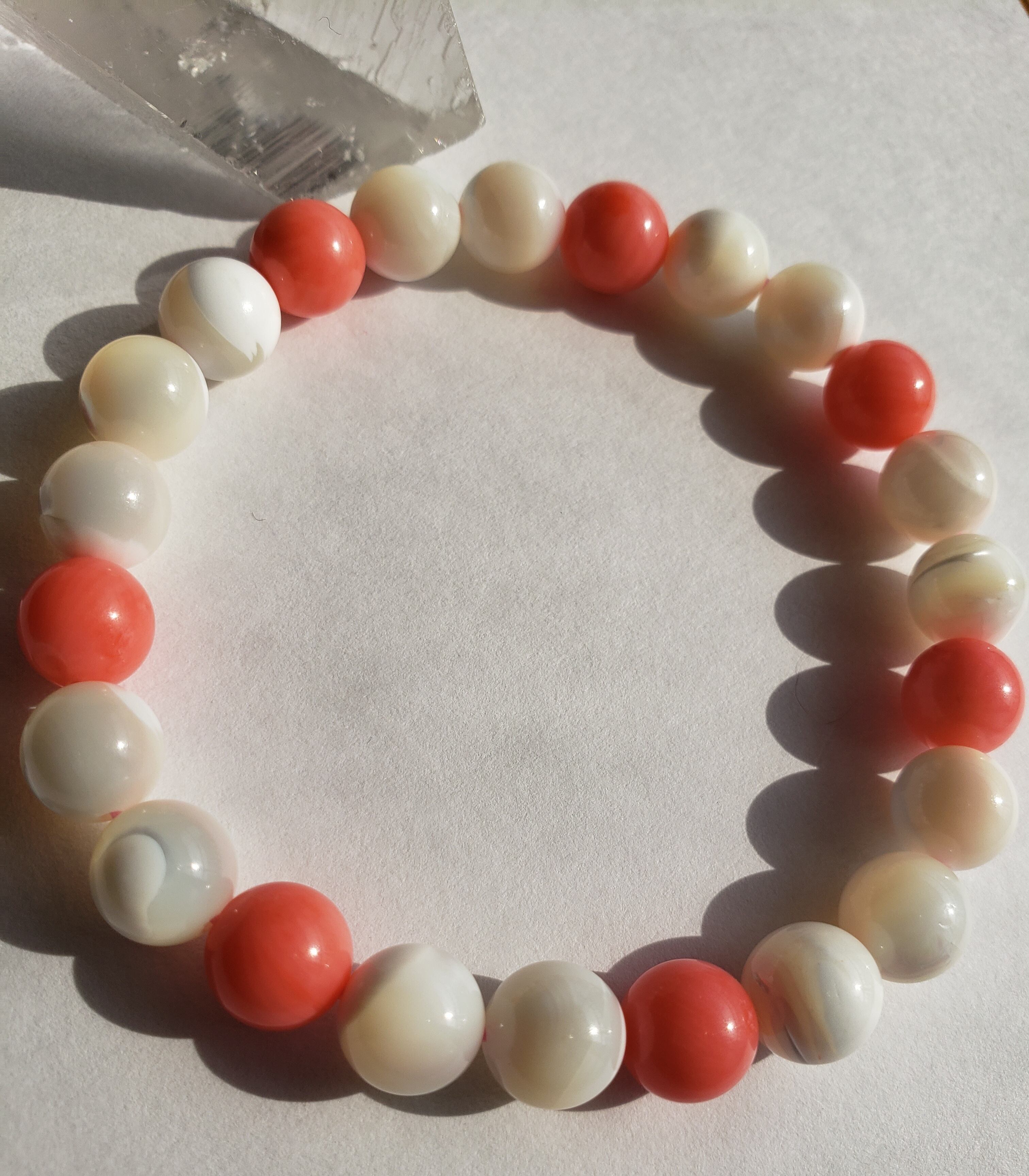 ~~~ マザーオブパールと(染め)コーラルのブレスレットです。