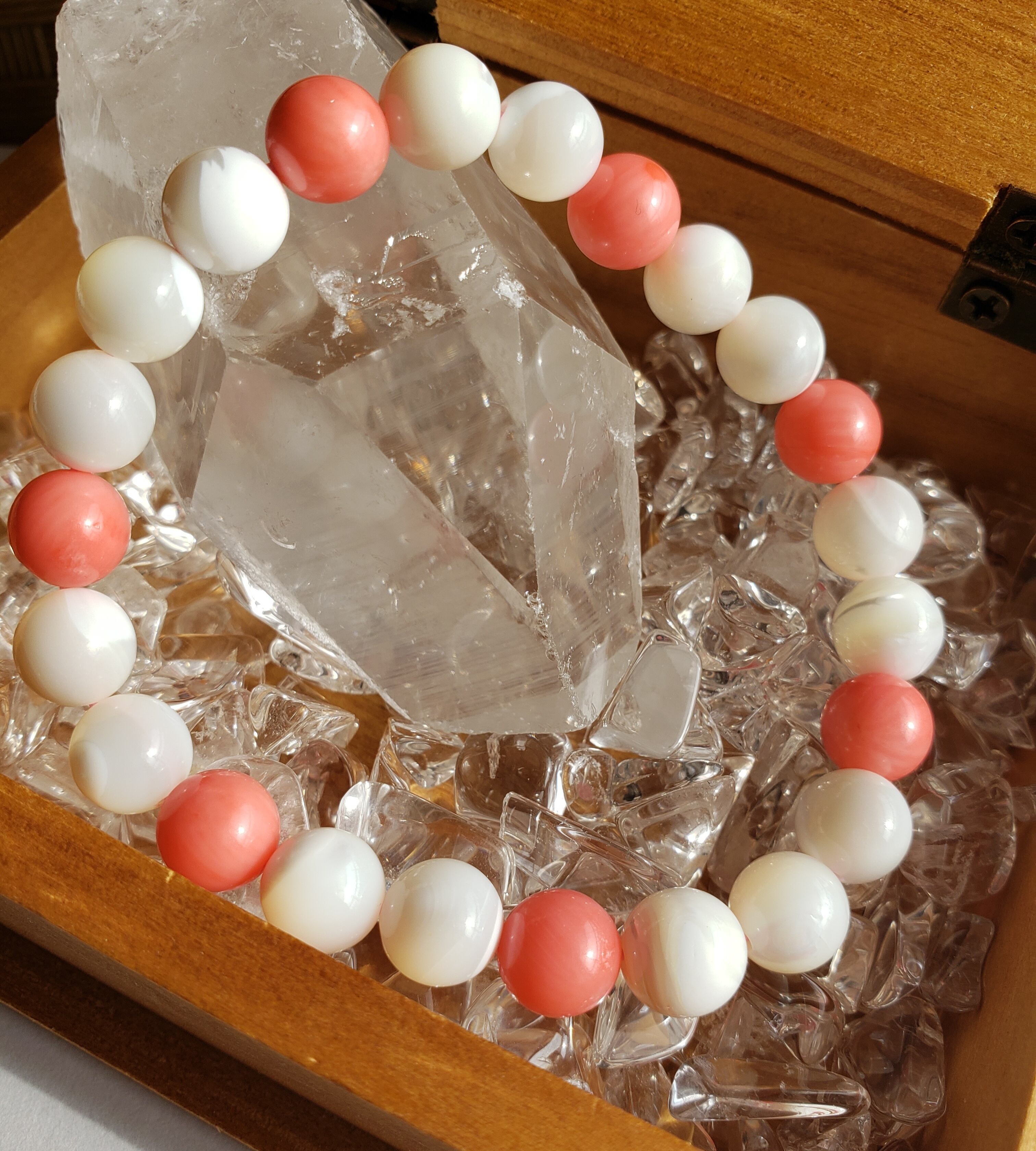 マザーオブパール(貝)と、(染め)コーラル(珊瑚)の海からの贈り物かのような素敵なブレスレットです ~~~