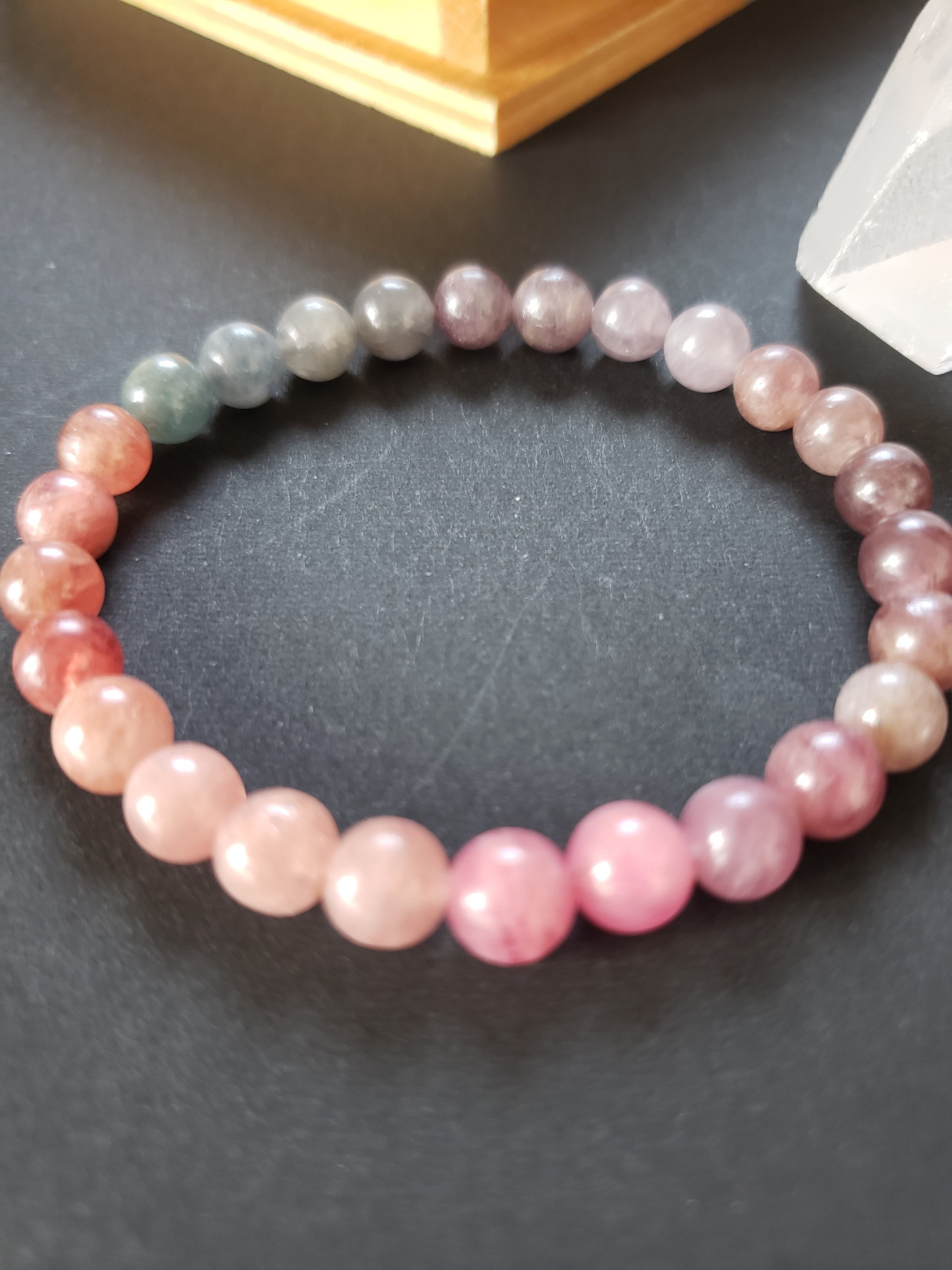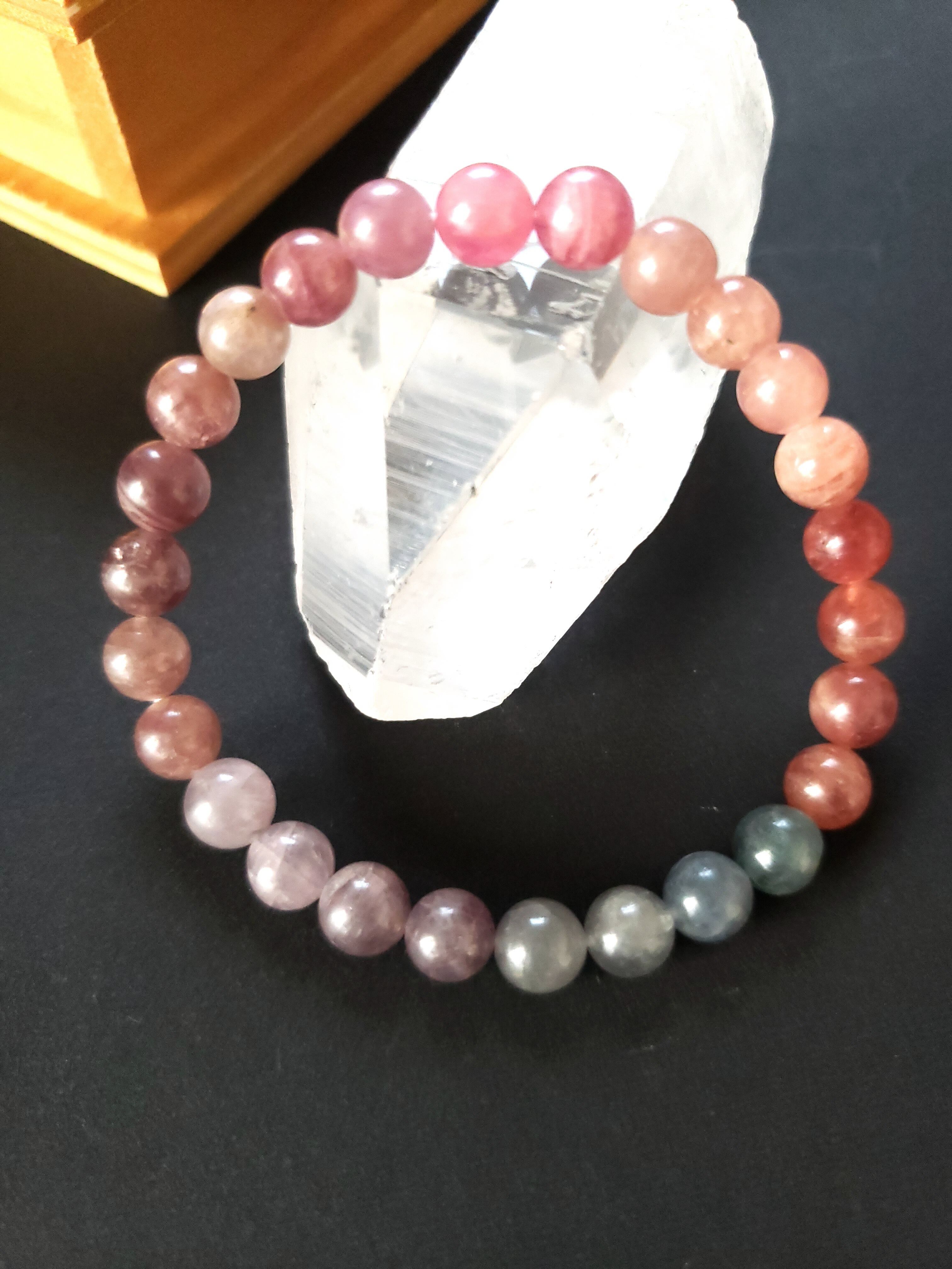 暗めの場所では落ち着いた雰囲気に、明るめピンクがポイントで、大人可愛いブレスレットです。 ~~~