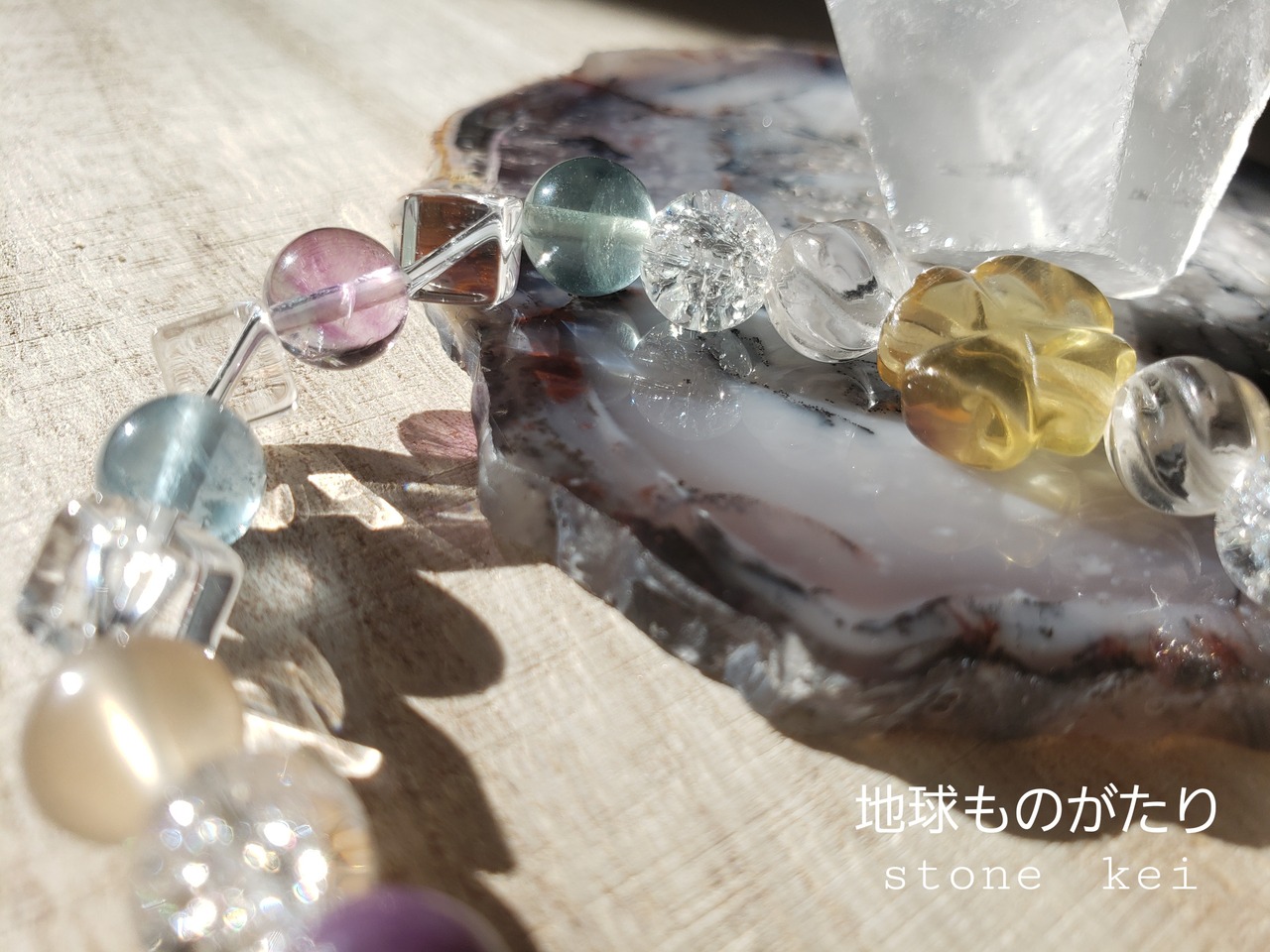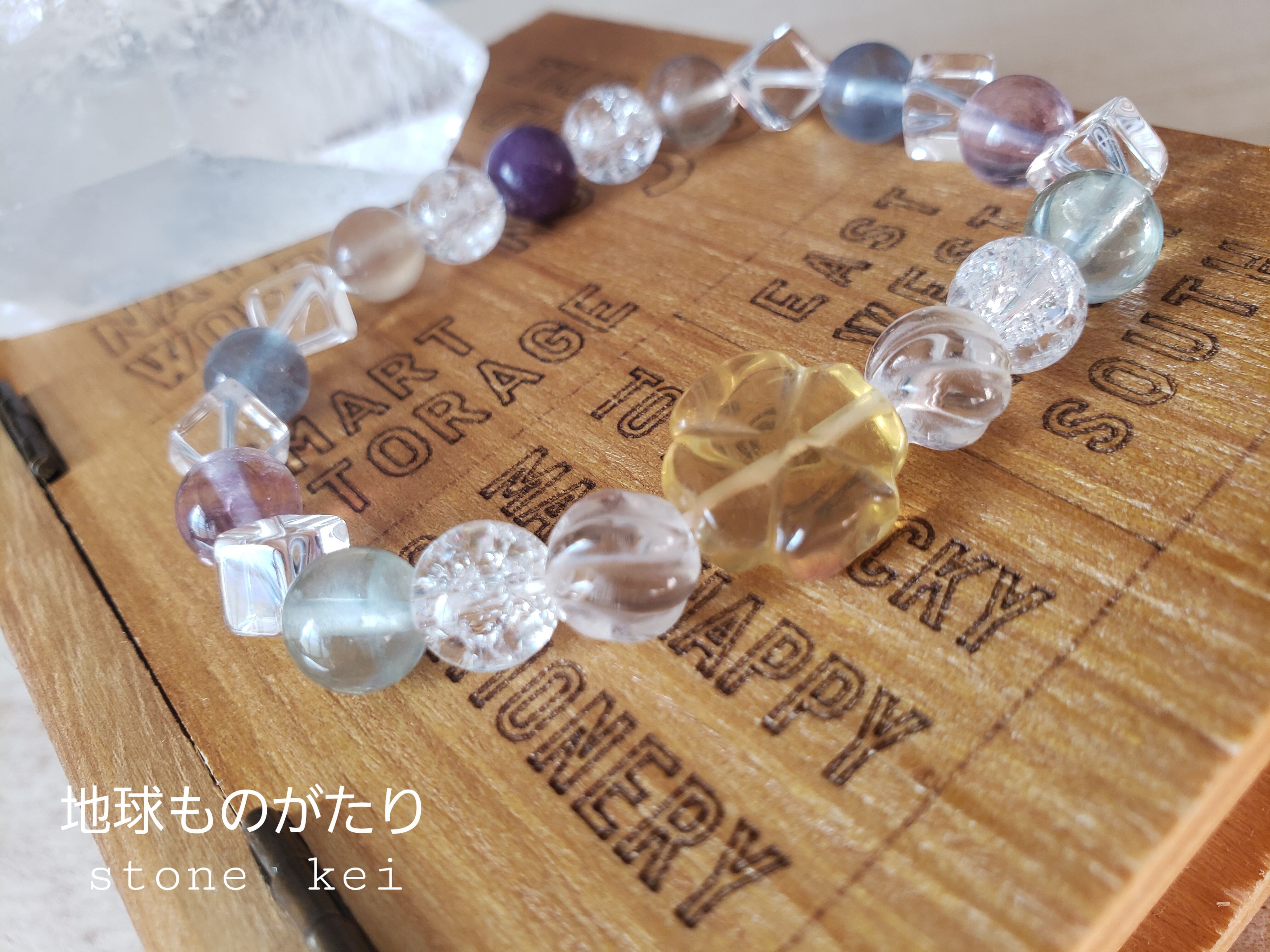水晶も3種類(キューブ・S字・クラック)使用した、キラキラブレスです。