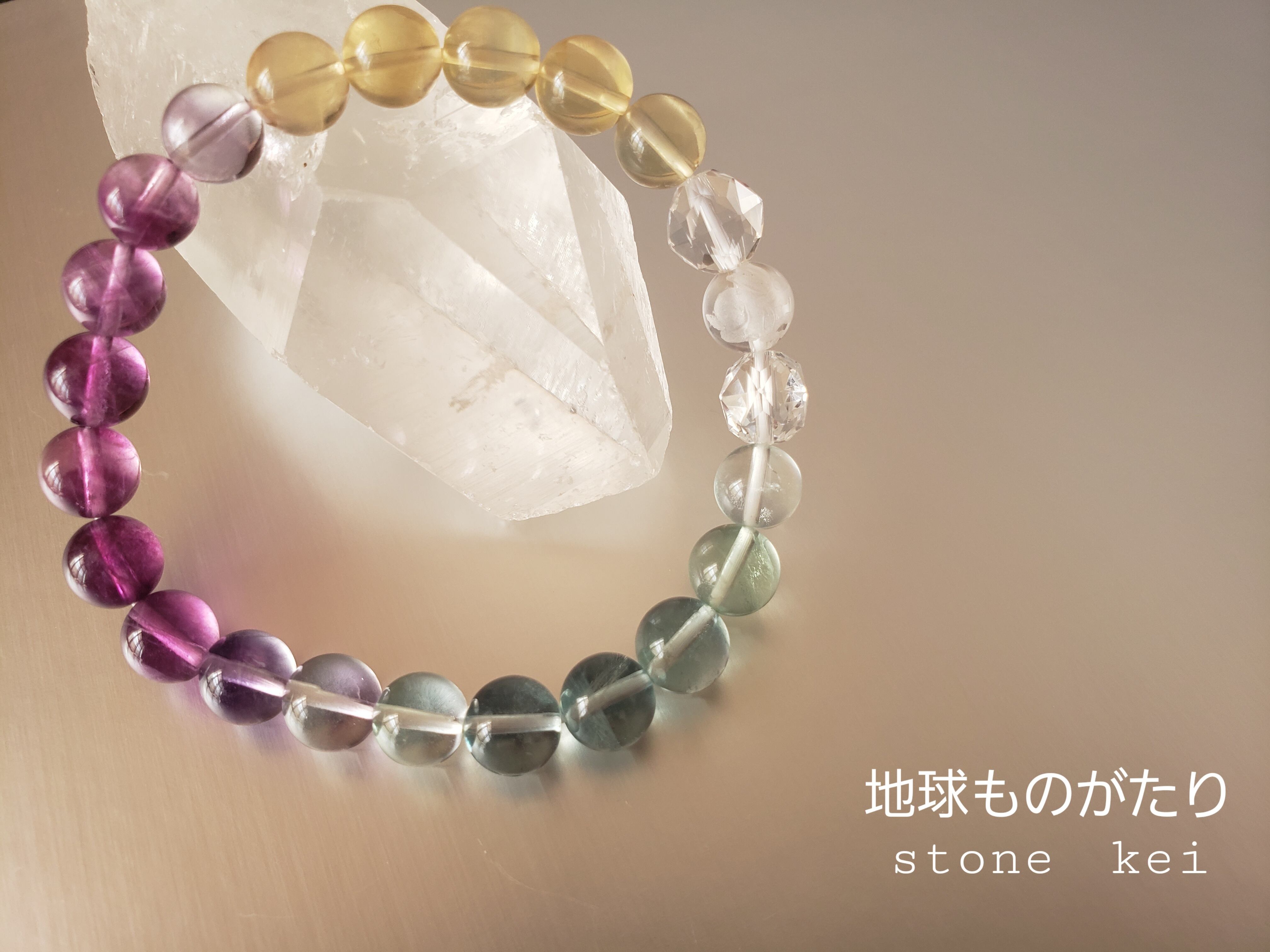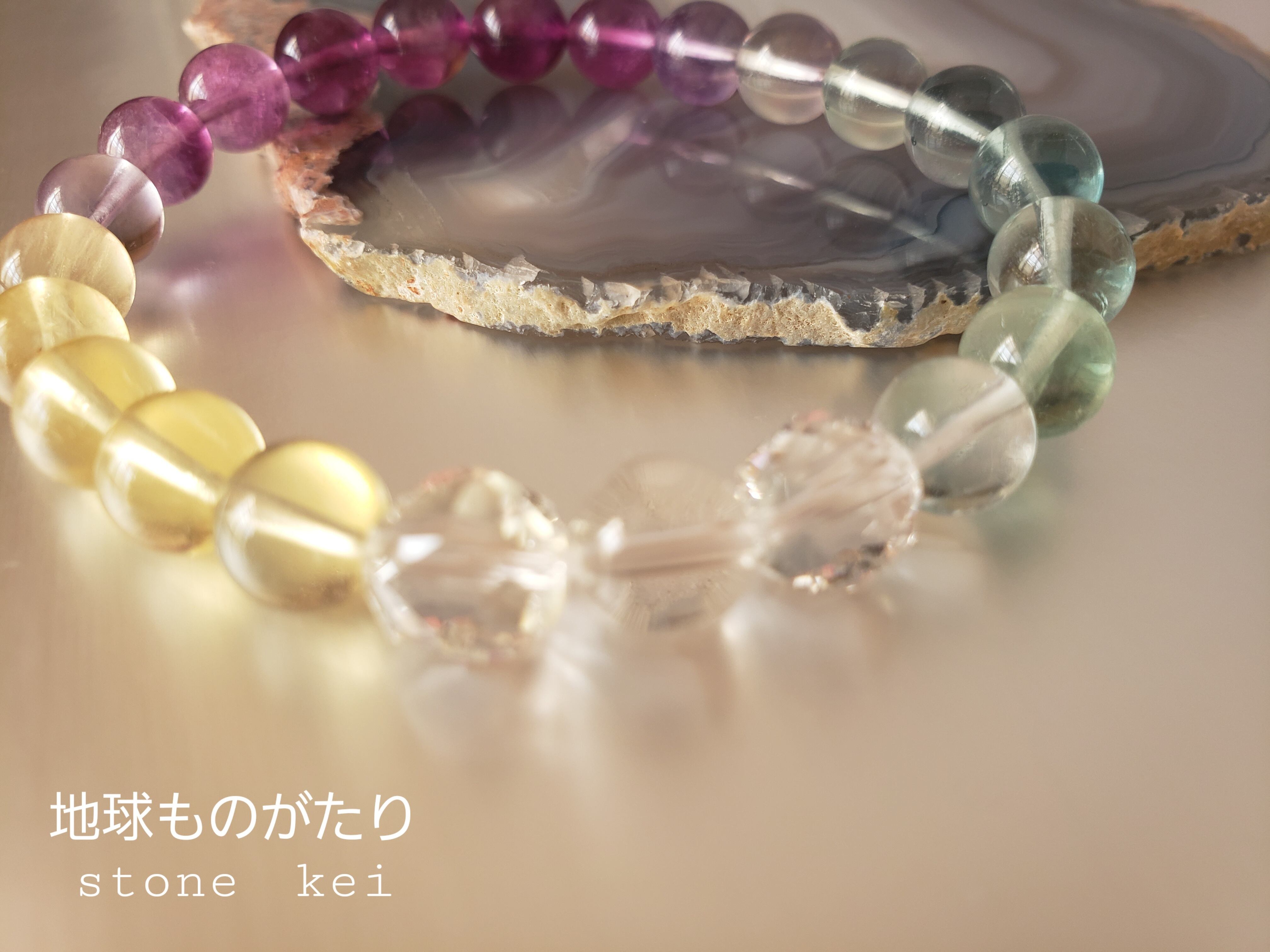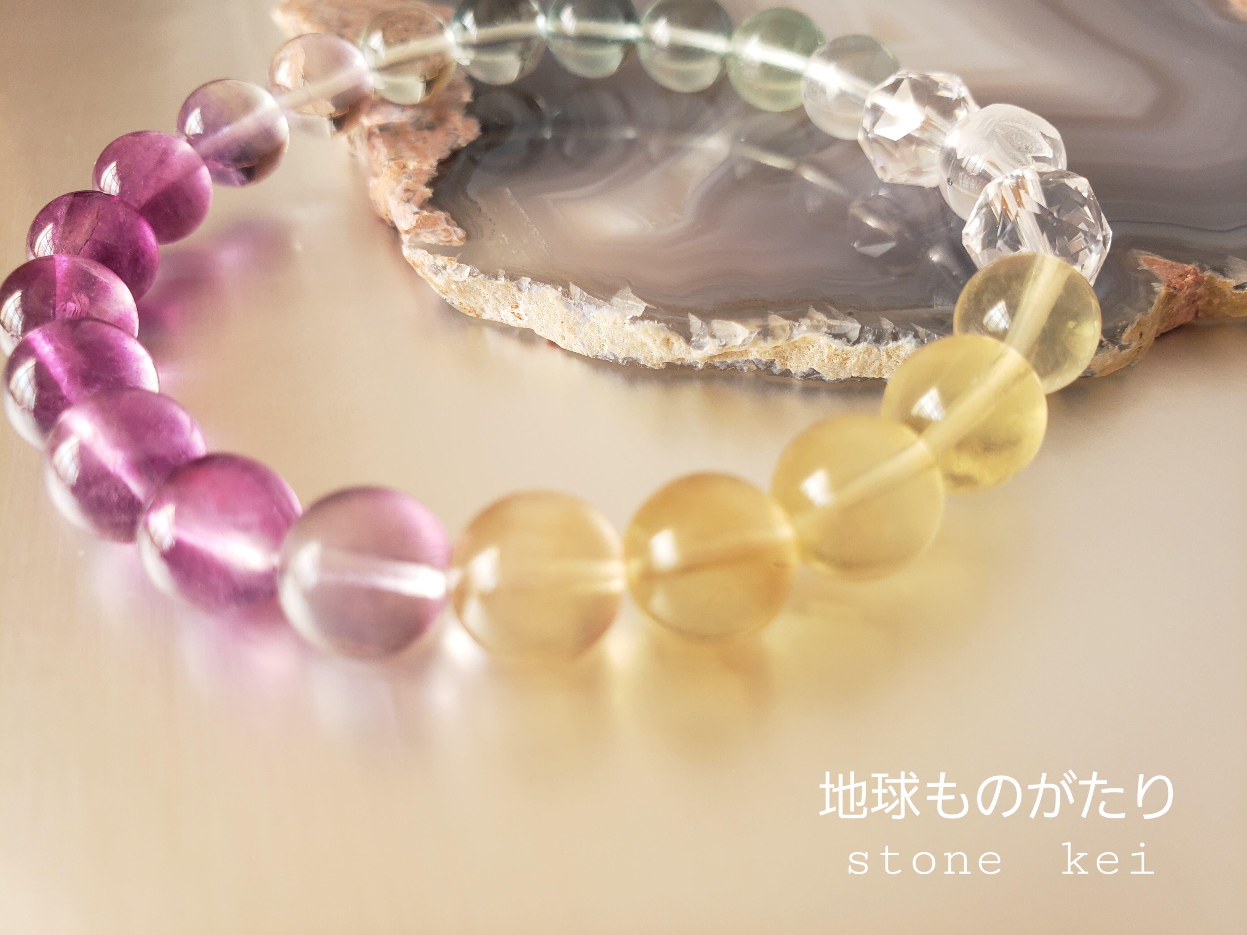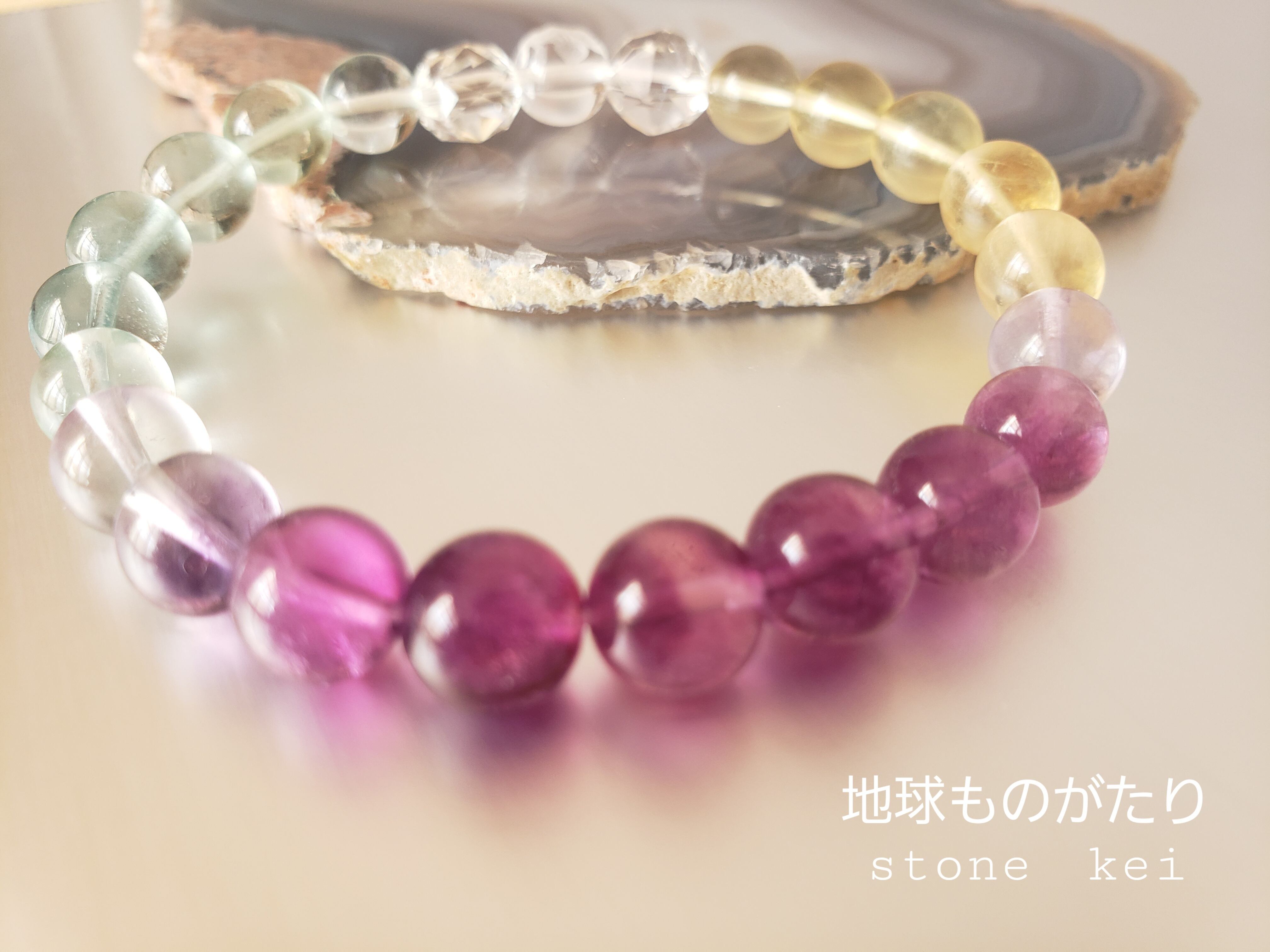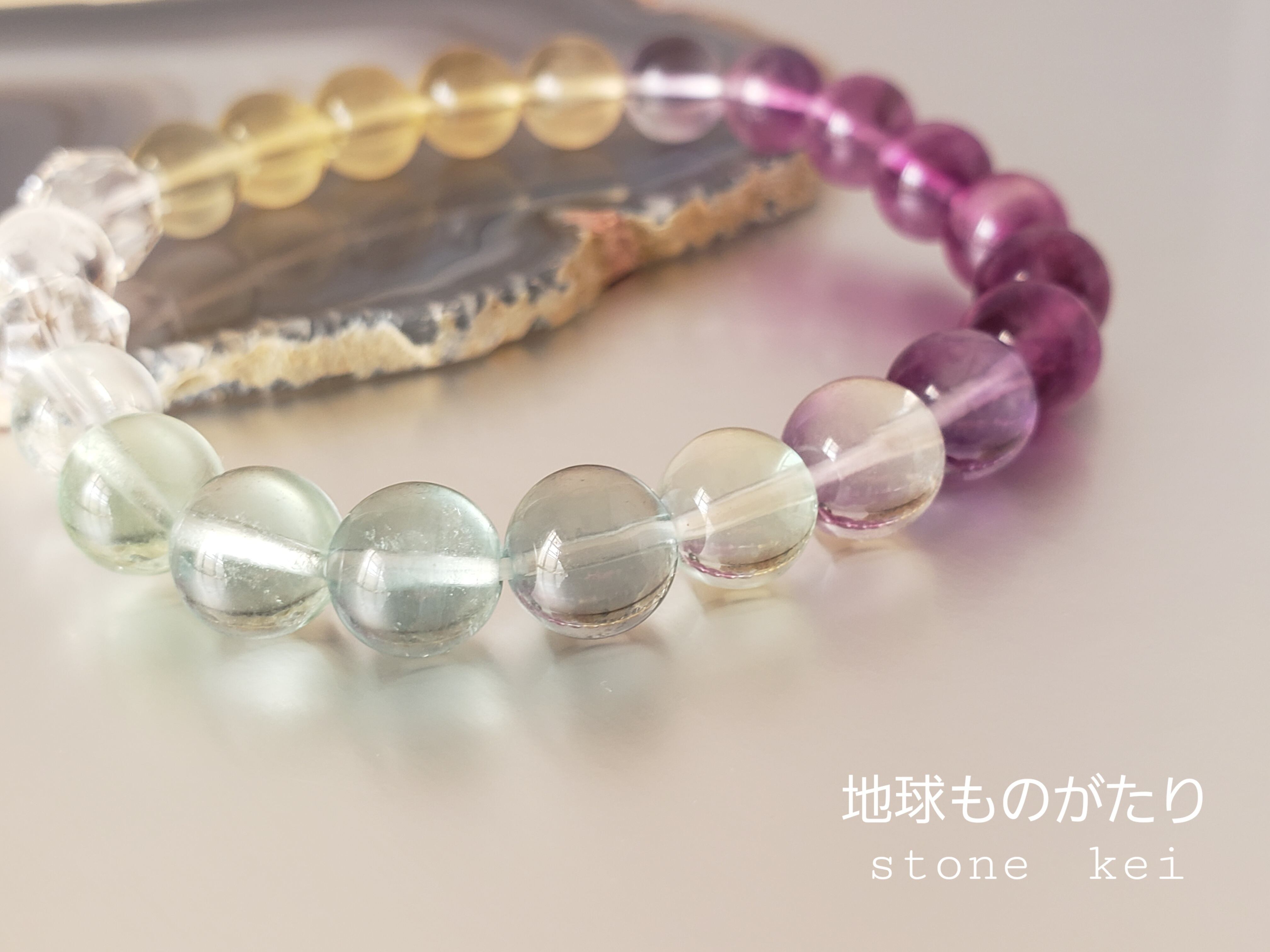 “フローライトは感情のバランスを整え、心と体を落ち着かせる石。ウサギは幸運のシンボルです。このうさぎとフローライトのグラデーションブレスレットは、幸せな気持ちになれるだけでなく、心身共にリラックスさせ、幸運を引き寄せるお守りにぴったりのアクセサリーです。